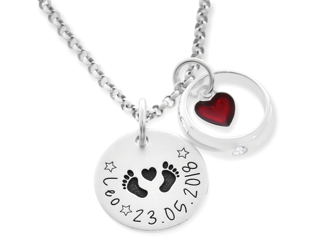 Eine wunderschöne Kette aus 925 Sterling Silber mit Anhängern. In der Mitte vom Plättchen sind die Motive "Babyfüße und Herz" graviert. Das 925 Sterling Silber Plättchen ist ca. 1,3 cm groß. Es passen max. 21 Zeichen inkl. Leerzeichen am Rand geschrieben für Ihren Wunschnamen bzw. Wunschtext auf das Plättchen. Am Anfang und am Ende Ihrer Wunschgravur sowie zwischen Ihren Angaben designen wir automatisch das Sternmotiv. Daneben hängt ein bezaubernden Taufring mit Herz.