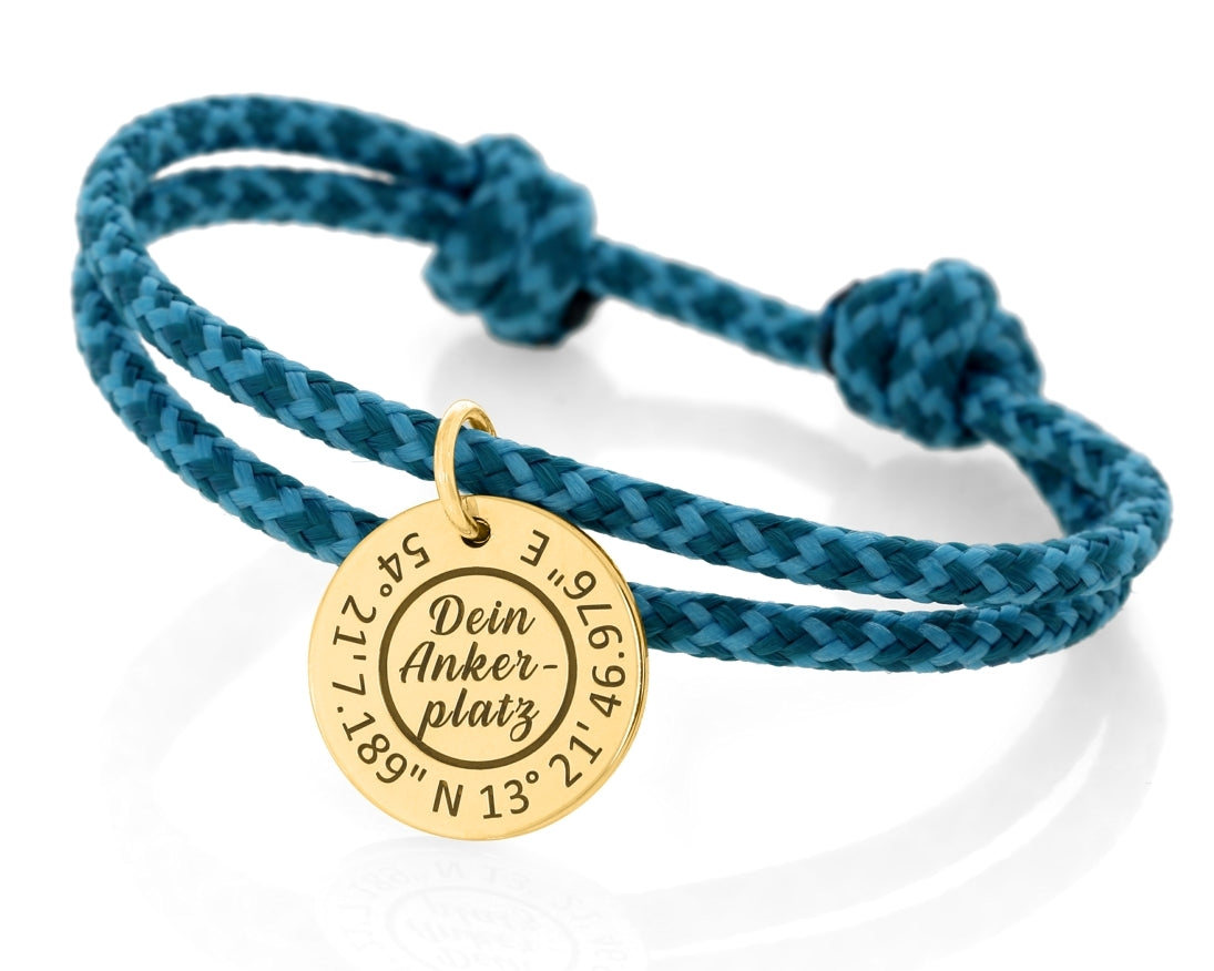 Armband petrol türkis Segelseil 3mm verstellbar Gravur Anhänger vergoldet