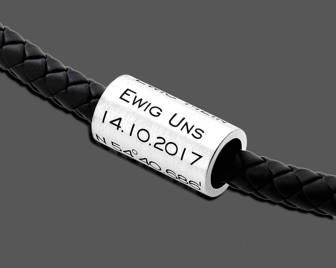 Eine kleine Rolle aus 925 Sterling Silber, die an einem Kautschuk Halsband getragen wird. Auf diese Rolle designen wir in max. 6 Zeilen Ihren Wunschtext bzw. Koordinaten. Pro Zeile stehen Ihnen ca. 12 Zeichen inkl. Leerzeichen zur Verfügung. Der Anhänger ist ca. 1,5 cm lang und 0,8 cm breit.