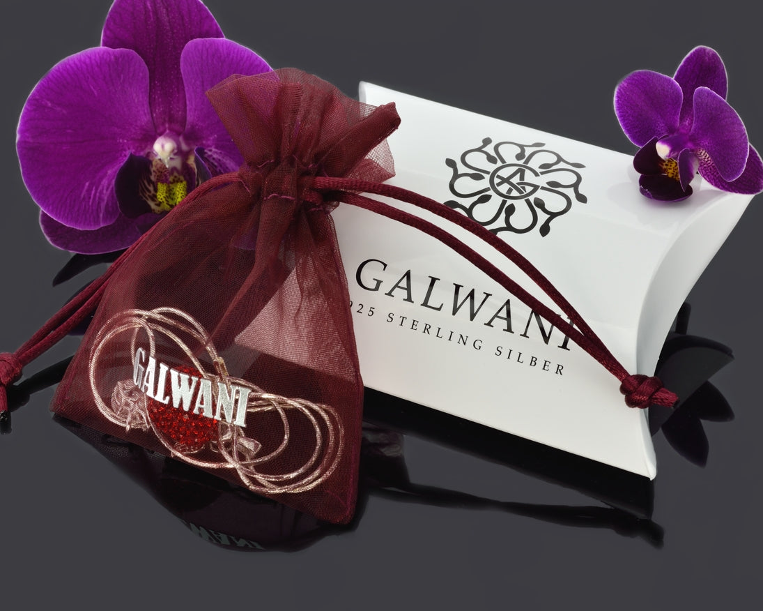 Jedes GALWANI Schmuckstück wird in einem edlen Schmuckbeutel und einer Geschenkverpackung liebevoll verpackt. Weiterhin ist bei jedem Schmuckstück ein GALWANI Schmuckzertifikat dabei.