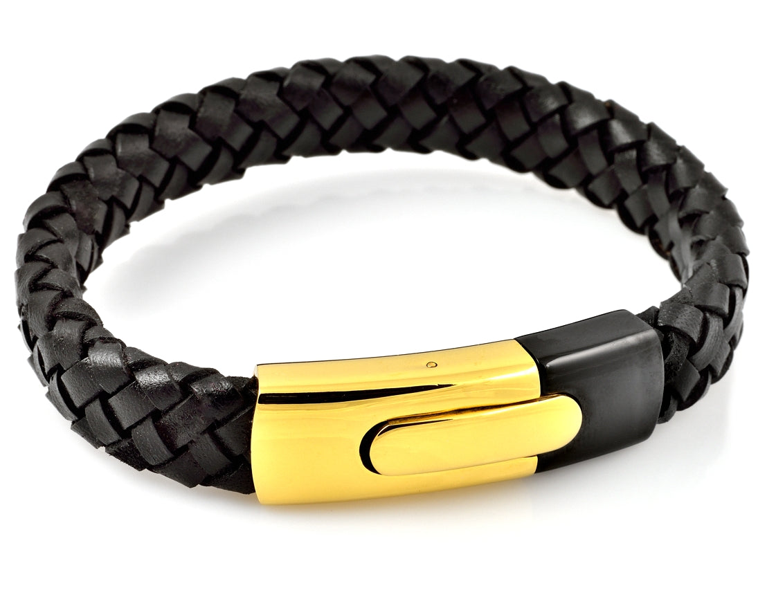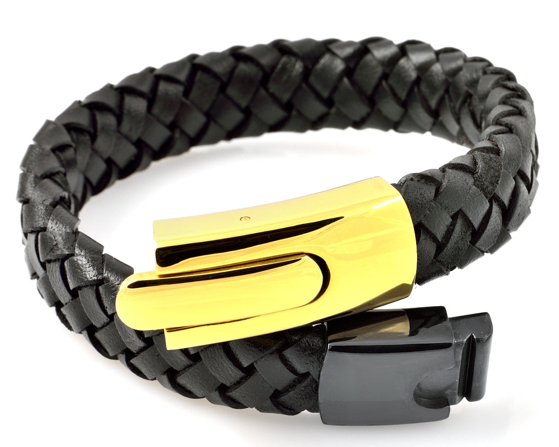 Dieses Männerarmband, wird aus sehr angenehm zu tragenden schwarzen Leder mit einem edlen Edelstahl-Magnetverschluss angefertigt. Der Edelstahl Verschluss ist gold-schwarz designed und hebt dieses besondere Herrenarmband exklusiv und detailiert ab.