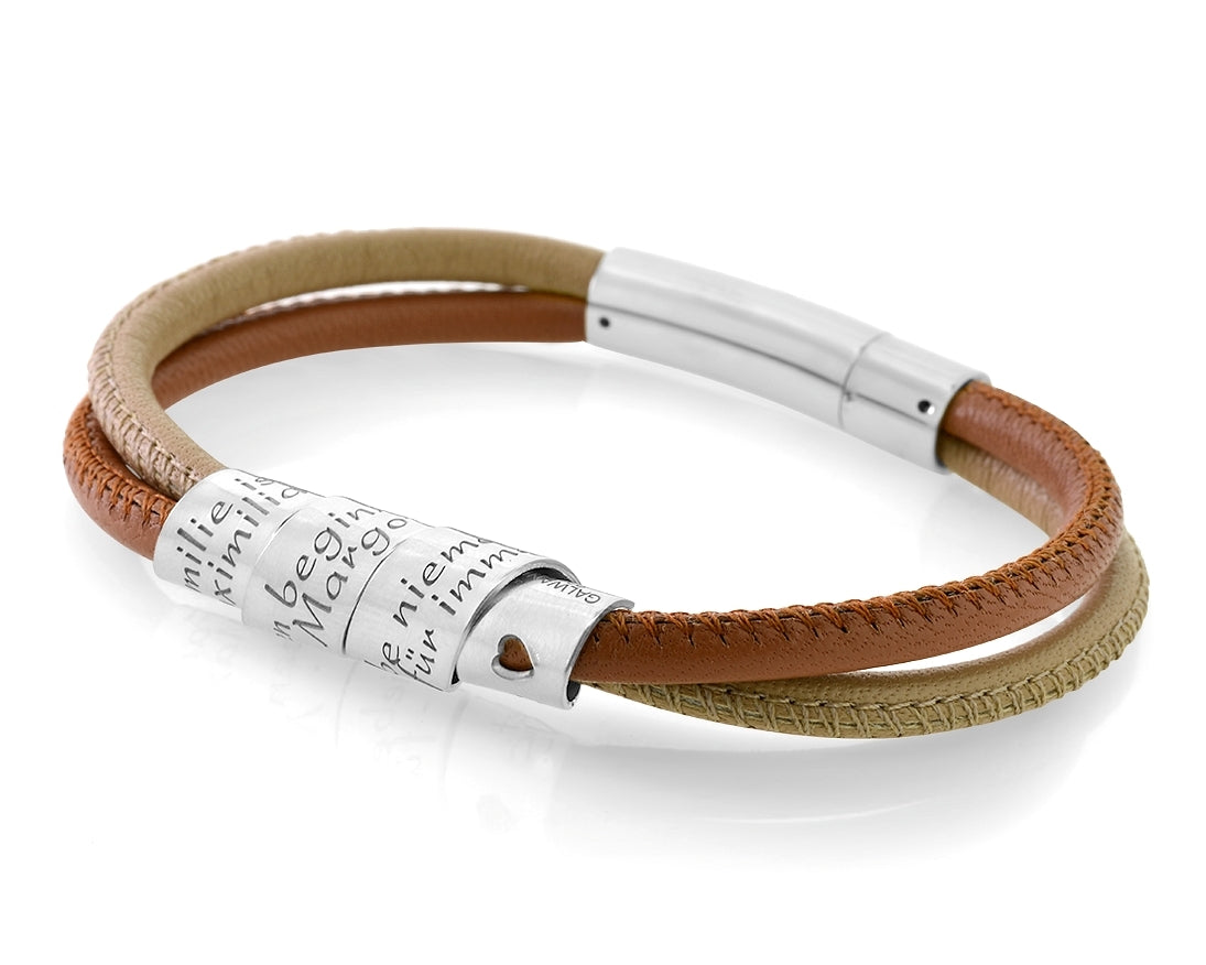LEDERARMBAND UNISEX BRAUN BEIGE GRAVUR SILBER BAJONETT