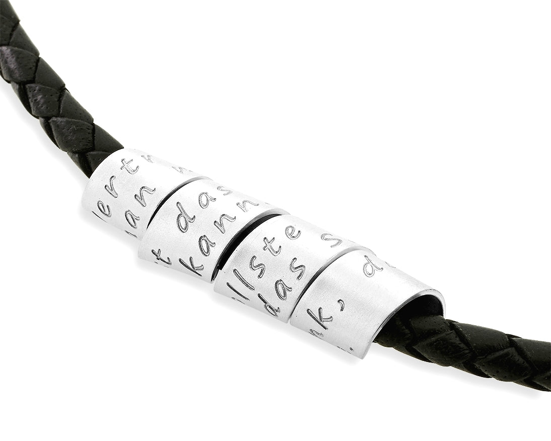 Die Lederkette ist geflochten und ca. 4 mm dick. Auf den Wickelanhänger aus 925 Sterling Silber designen wir Ihren Wunschtext mit maximal ca. 90 Zeichen inkl. Leerzeichen rauf. Dieser besondere Anhänger wird komplett aus 925 Sterling Silber in unserer hauseigenen GALWANI Silberschmiede und Schmuckatelier zu Ihrem ganz persönlichem Schmuckstück mit viel Liebe zum Detail hergestellt.