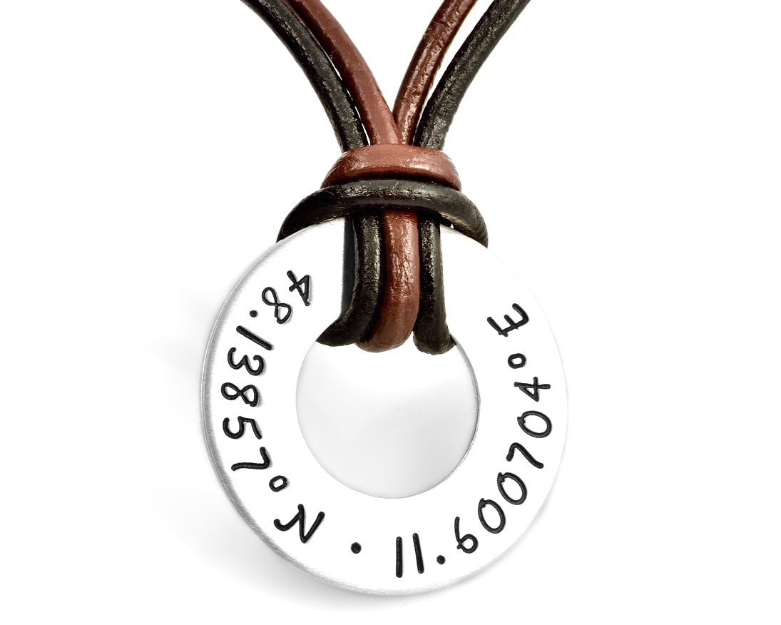 Eine exklusive Herrenkette mit einem Anhänger Ring aus 925 Sterling Silber mit Ihren Wunschkoordinaten oder Ihrem Wunschtext und einer Lederkette in schwarz-braun, die mit einem Karabinerverschluss geschlossen wird.