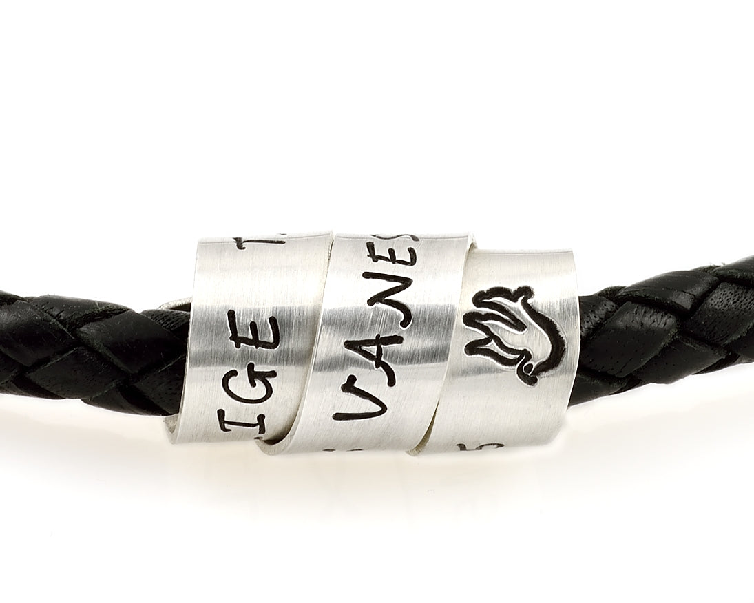 Auf dieses Armband designen wir Ihren Wunschtext mit maximal ca. 45 Zeichen inkl. Leerzeichen rauf.