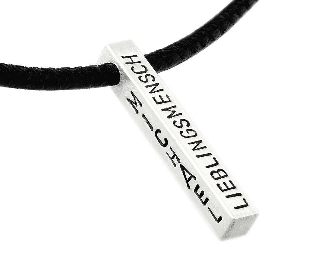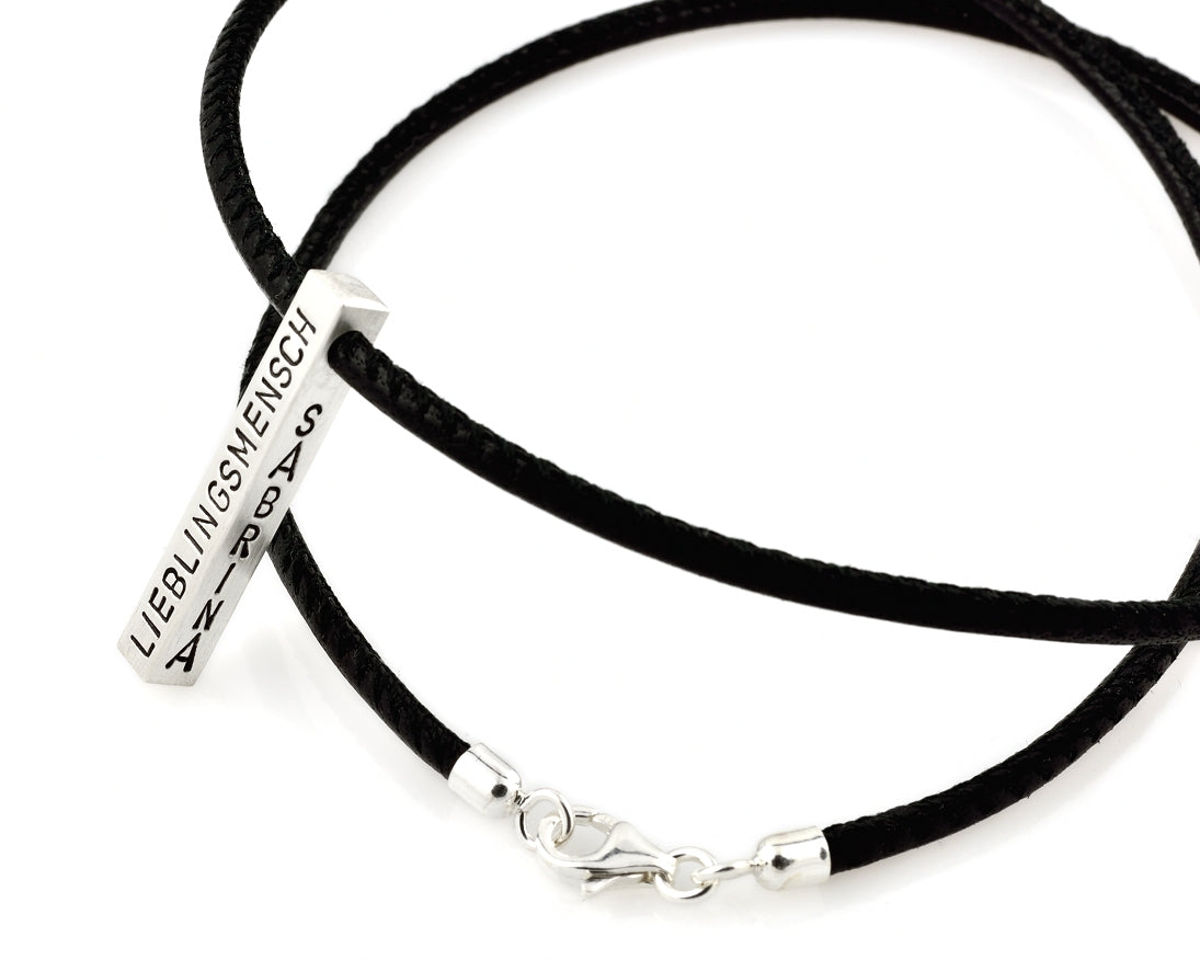 Geben Sie bitte Ihre gewünschte Kettenlänge, Lederfarbe und Ihren Wunschtext in die vorgegebenen Textfelder beim Kauf an.