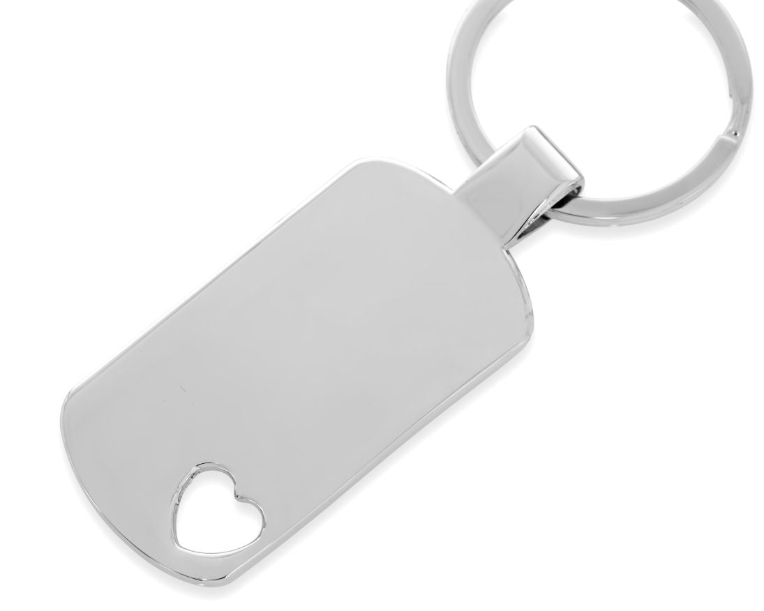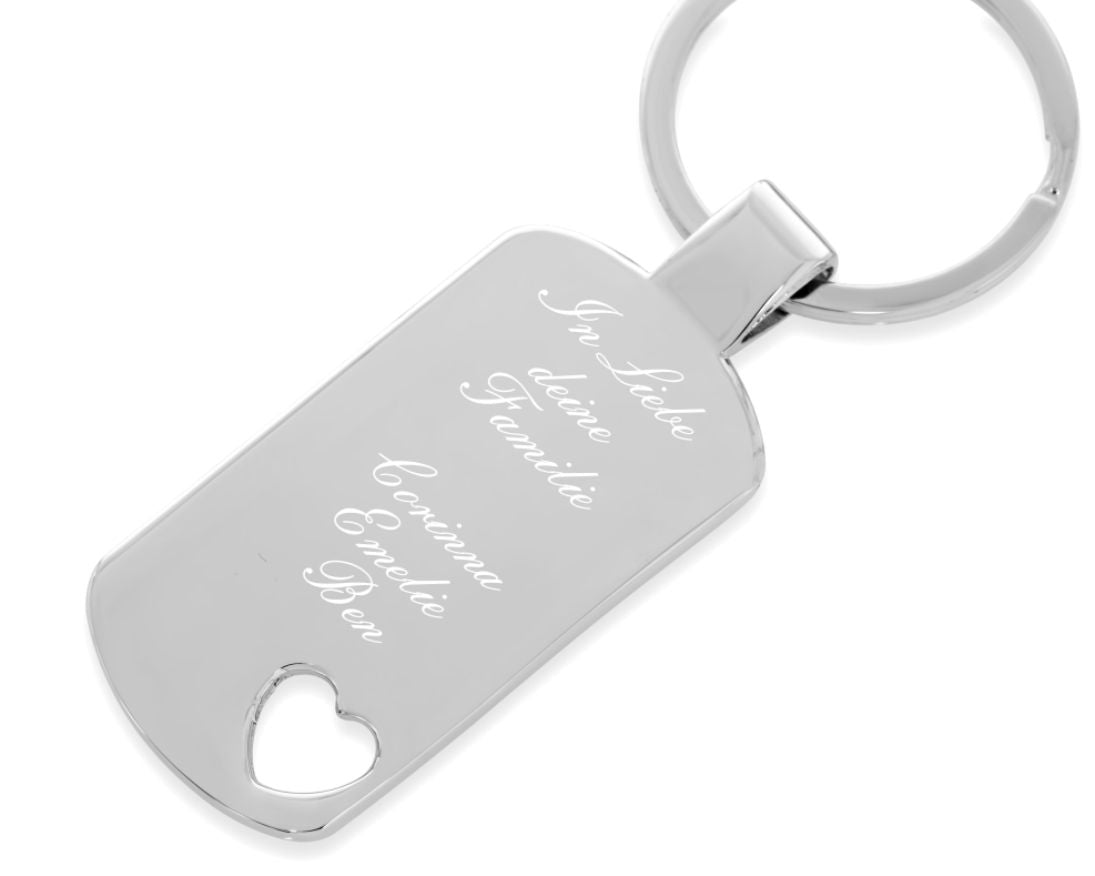 Ein massiver, glänzend polierter, personalisierter Anhänger mit Schlüsselring. Auf dem Anhänger mit Herzauschnitt wird Ihr Wunschtext, Wunschnamen etc. designed.