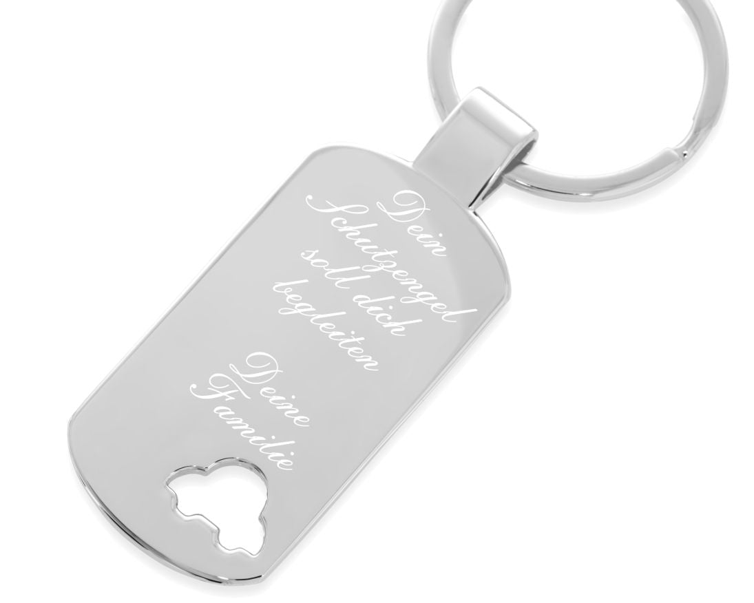 Ein massiver, glänzend polierter, personalisierter Anhänger mit Schlüsselring. Auf dem Anhänger mit Autoauschnitt wird Ihr Wunschtext, Wunschnamen etc. designed.