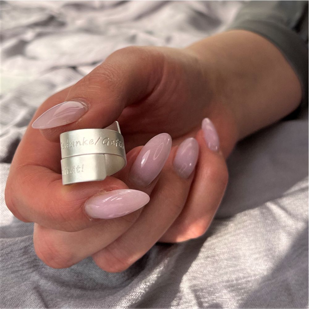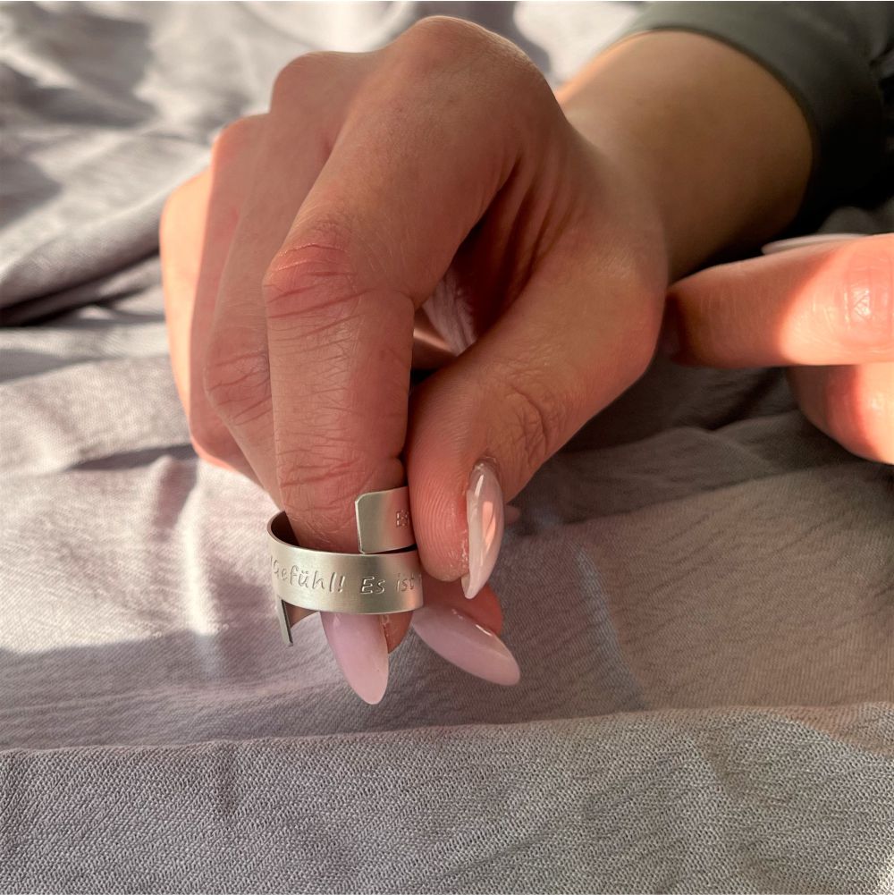 Auf dem Ring wird außen Ihr Wunschtext bzw. Botschaft rauf designed. Eine Beschriftung auf der Innenseite des Silberringes ist leider nicht möglich.