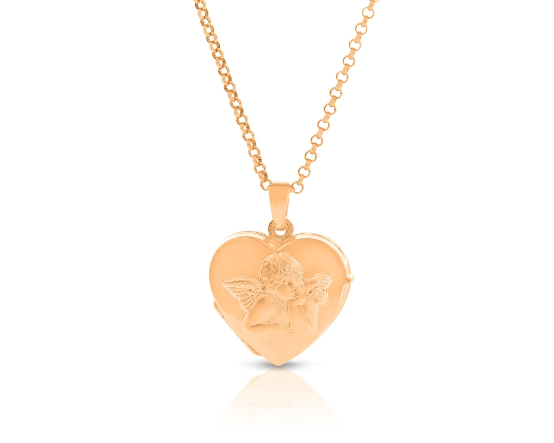 Auf der Vorderseite ist ein dreidimensional nach außen gestanzter Engel. Das bezaubernde Medaillon aus 925 Sterling Silber ist aufklappbar und bietet Platz für ein Foto oder ein kleines Geheimnis. Das Medaillon ist inkl. Öse/Schlaufe ca. 1,8x2,4cm. Alle Metallelemente sind aus 925 Sterling Silber und werden in Juwelierqualität hochwertig rosé vergoldet.