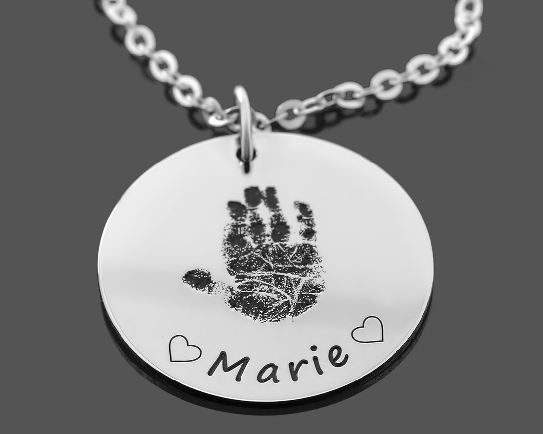 HANDABDRUCK KETTE, GESCHENK ZUR GEBURT, SCHMUCK FÜR MAMA MIT GRAVUR, ANHÄNGER MIT HANDABDRUCK