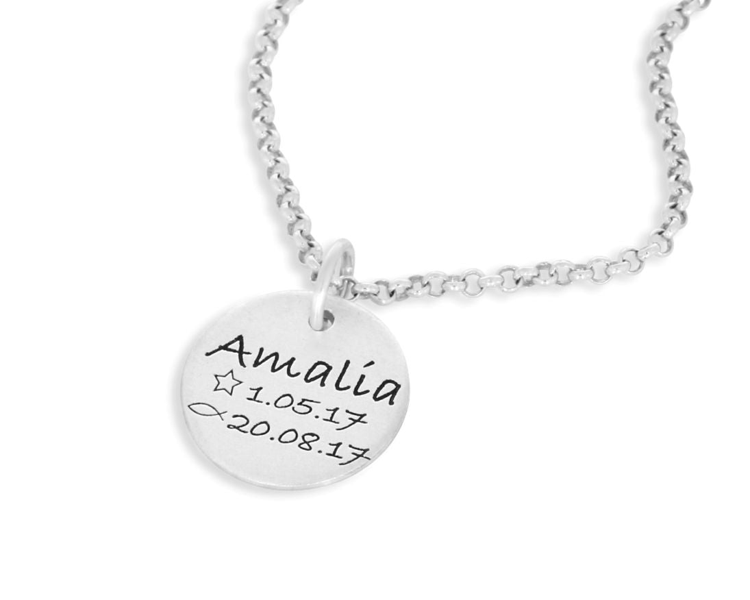 Eine wunderschöne Kette aus 925 Sterling Silber designed mit Ihren Wunschnamen bzw. Wunschtext. Das 925 Sterling Silber Plättchen ist ca. 1,3 cm groß. Auf das Namensplättchen (ca.1,3 cm groß) passt Ihr Wunschname mit max. 10 Zeichen inkl. Leerzeichen sowie das Geburtsdatum und das Taufdatum (z.B. TT.MM.JJ) mit den jeweils abgebildeten Motiven "Stern" und "Tauffisch" rauf. Die Ösen werden von uns fachmännisch gelötet.