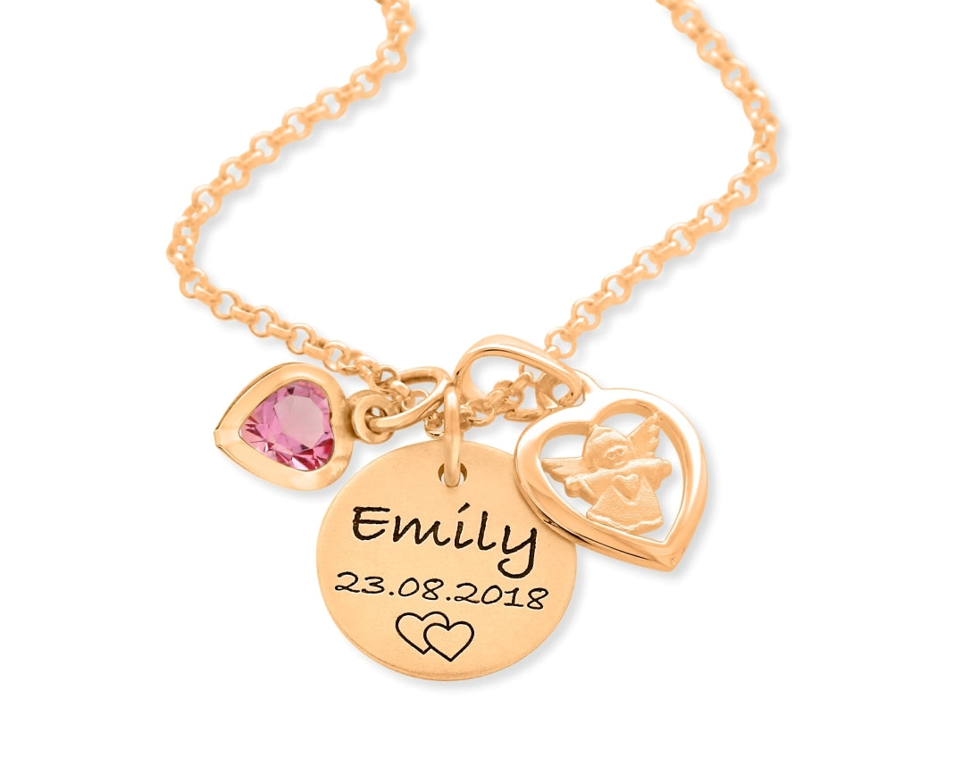 Eine bezaubernde Kette komplett aus rosé vergoldetem 925 Sterling Silber mit Ihrem Wunschtext designed. Das Plättchen ist ca. 1,3 cm groß. Es passen maximal ca. 20 Zeichen inkl. Leerzeichen mittig geschrieben auf das Plättchen. Unter dem Text wird Ihr Wunschmotiv graviert. Eine Gravur auf der Rückseite des Plättchen ist ebenfalls möglich. Daneben hängt ein wundervoller Herz-Engel Anhänger und ein Herz Kristall Anhänger.