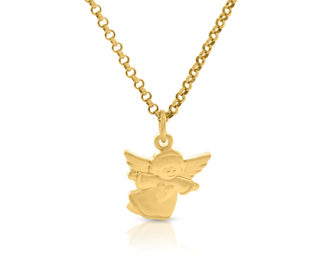 Der bezaubernde kleiner Engel Anhänger ist ca. 1,5 cm groß (ohne Öse). Der Anhänger ist auf der Vorder- & Rückseite edel mattiert und hängt an einer 925 Sterling Silber Kette und eignet sich auch als schönes Geschenk für Anlässe wie Taufe, Kommunion, Konfirmation, Geburt oder Einschulung.Alle Metallelemente sind aus 925 Sterling Silber und in Juwelierqualität hochwertig vergoldet.