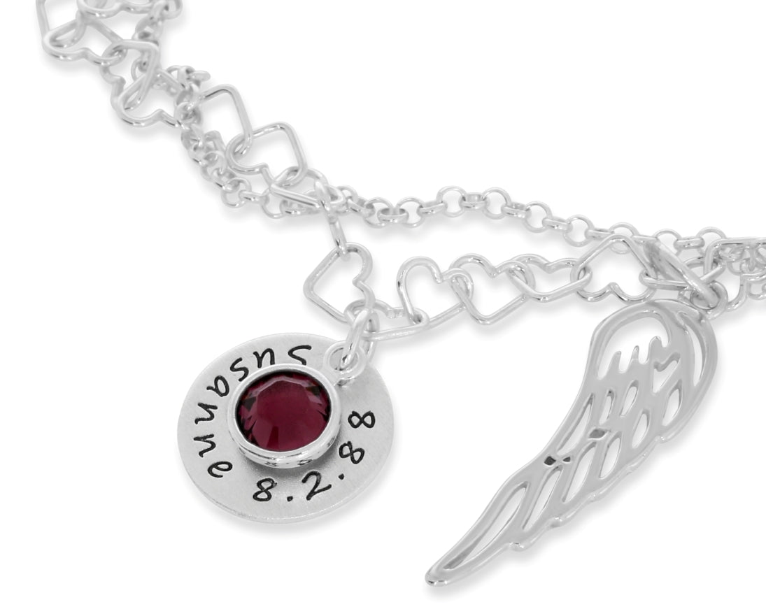 An dem Armband ist ein Engelsflügel, ein Geburtsstein und ein besonderes Gravurplättchen (ca. 1,3 cm groß) befestigt. Das Plättchen wird mit einer hochwertigen Gravur personalisiert. Hierfür stehen Ihnen am Rand entlang max. ca. 14 Zeichen inkl. Leerzeichen zur Verfügung. Der Swarovski Geburtsstein kann in der Farbe des Geburtsmonats oder in Ihrer Wunschfarbe an das Armband designed werden.