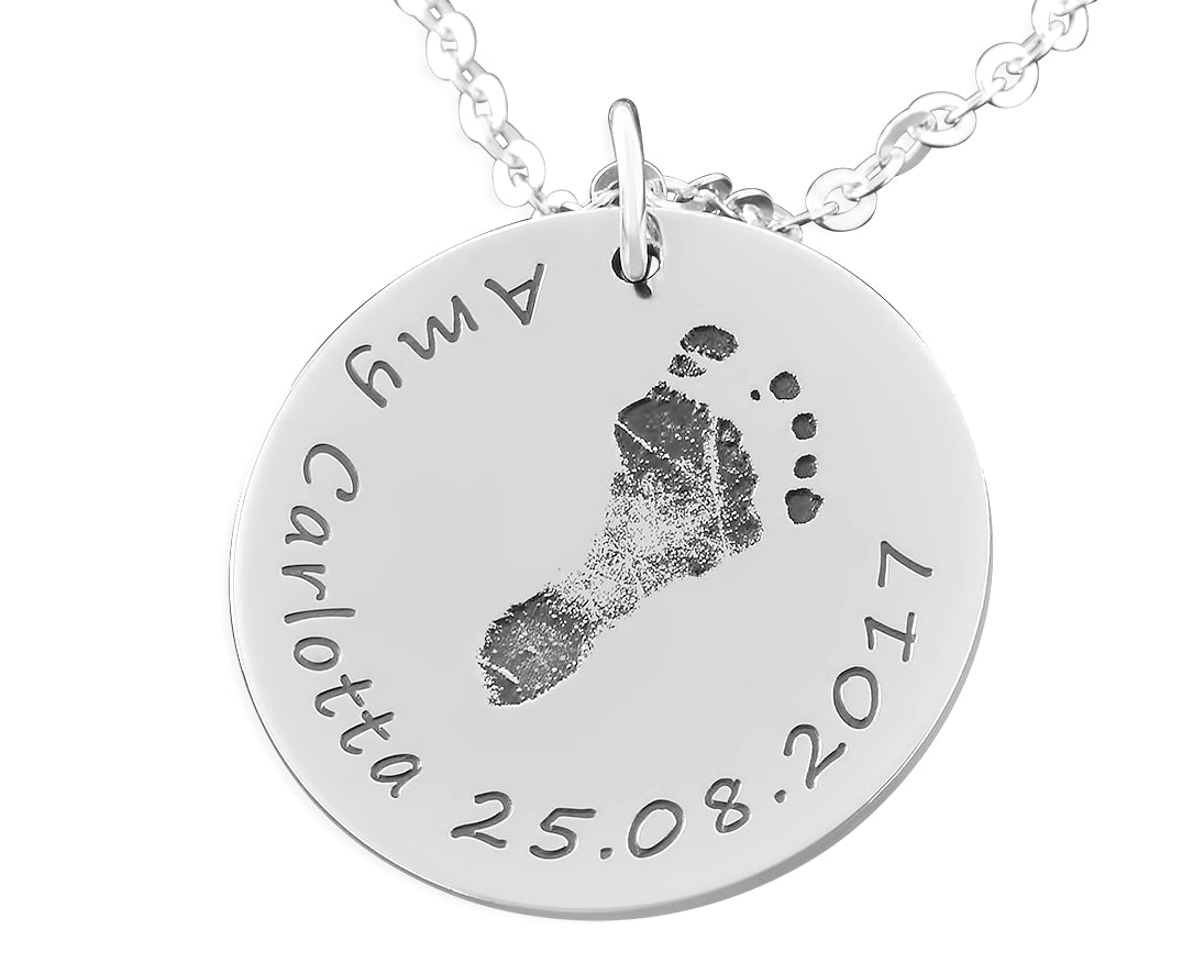 Eine exklusive Kette mit einer Gravurplatte aus 925 Sterling Silber Plättchen (ca. 2,3 cm groß) mit Ihrem eigenen Fußabdruck, Handabdruck, Fingerabdruck etc. und Ihrem Wunschtext graviert. Auf dem Anhänger kann ein Fußabdruck und Ihr Wunschtext mit max. 32 Zeichen inkl. Leerzeichen designed werden.