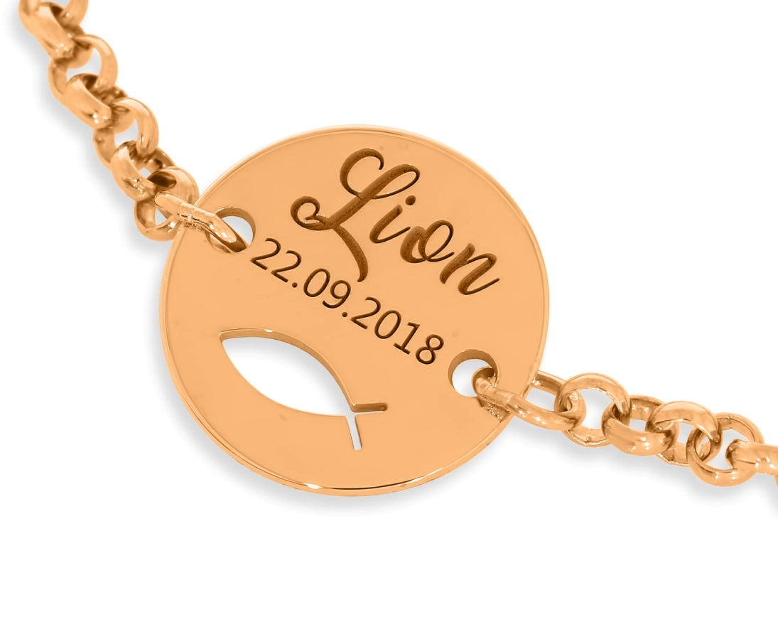 TAUFARMBAND ROSÉ VERGOLDET GRAVUR NAME TAUFE FISCH