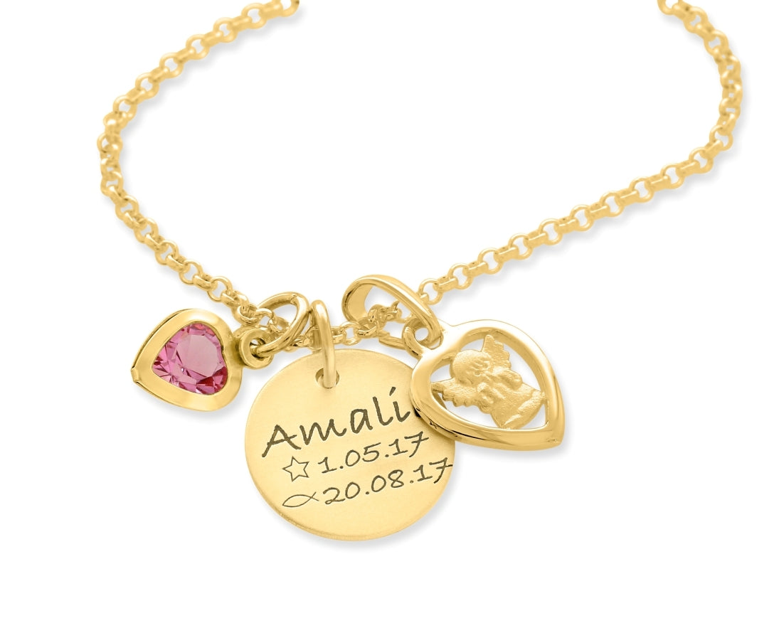 Eine wunderschöne Kette komplett aus vergoldetem 925 Sterling Silber mit Ihrem Wunschtext designed. Auf das Namensplättchen (ca.1,3 cm groß) passt Ihr Wunschname mit max. 10 Zeichen inkl. Leerzeichen sowie das Geburtsdatum und das Taufdatum (z.B. TT.MM.JJ) mit den jeweils abgebildeten Motiven "Stern" und "Tauffisch" rauf. Die Ösen werden von uns fachmännisch gelötet. Eine Gravur auf der Rückseite des Plättchen ist ebenfalls möglich. Daneben hängt ein wundervoller Engel Anhänger und ein Herz Kristall in Ihrer Wunschfarbe.