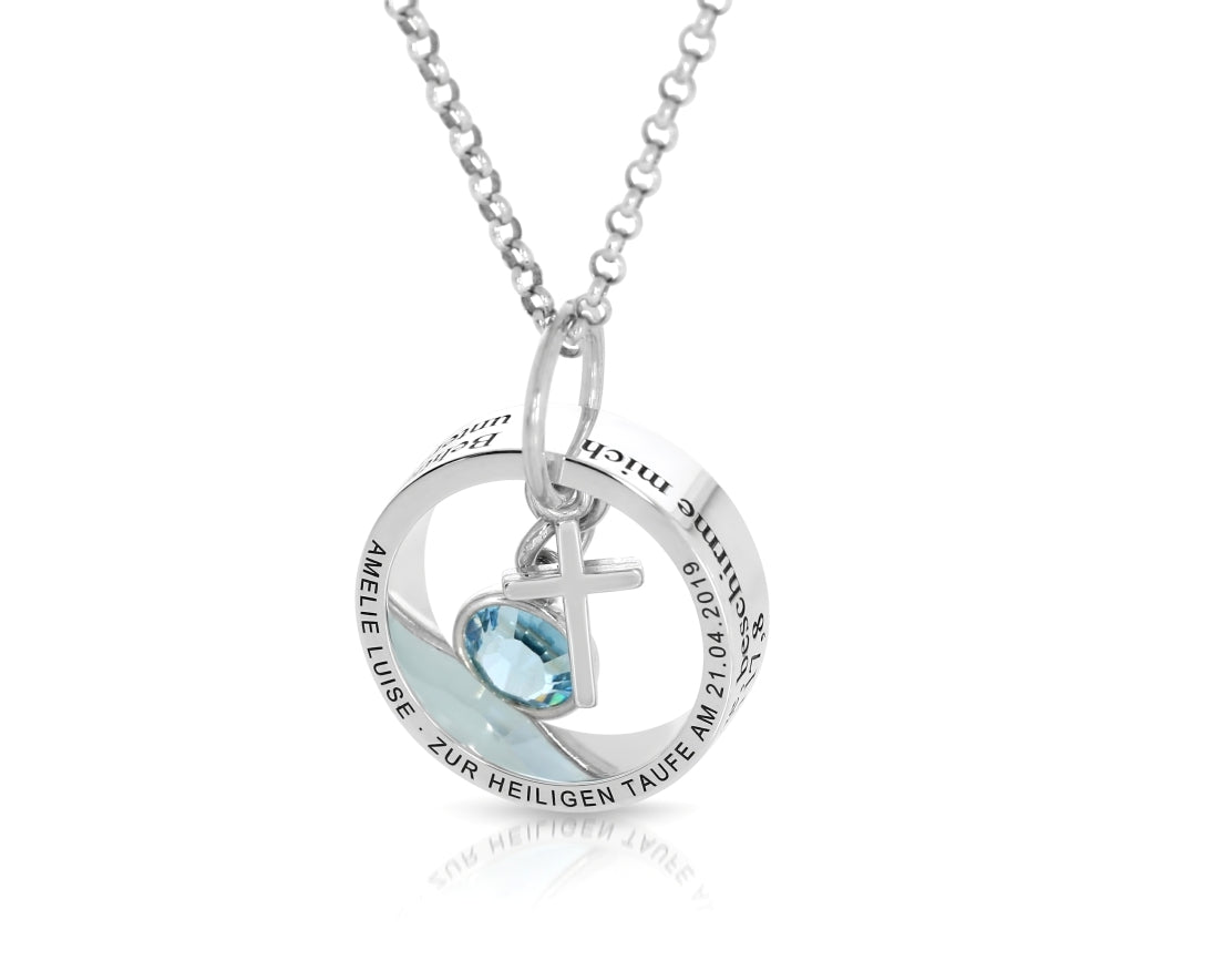 Ein wunderschöne Taufkette aus 925 Sterling Silber mit einem besonderen Ringanhänger designed mit Ihren Wunschnamen bzw. Wunschtext. In dem Anhänger hängt ein kleiner Kreuz Anhänger aus 925 Sterling Silber sowie ein Swarovski Geburtsstein in der Farbe des Geburtsmonats oder in Ihrer Wunschfarbe.