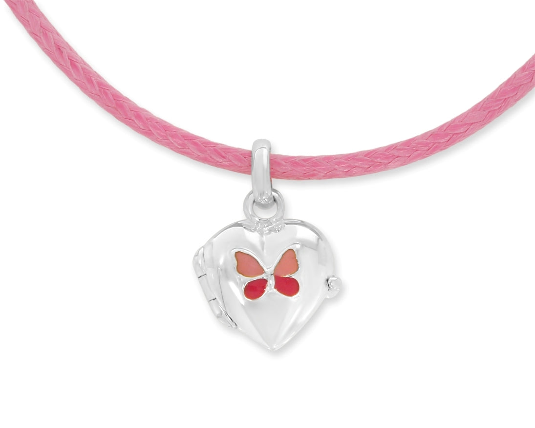 Hübsches Herz Medaillon aus 925er Silber an einer weichen Baumwollkette. Sie können den zierlichen Herz Medaillon Anhänger öffnen und ein bis zwei Bilder einsetzen. Mit dem Medaillon können Sie Ihre Liebsten immer bei sich tragen. Das kleine Herz Medaillon besticht durch seine schlichte polierte Oberfläche und den herrlich gestalten Schmetterling ins rosé Tönen.