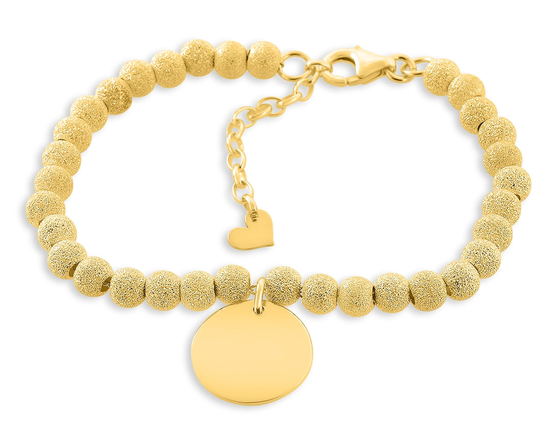 Ein wunderschönes Kugelarmband mit strukturierten, glänzenden Perlen. Die Perlen sind ca. 5mm groß. Der Verschluss inkl. Kettchen mit Herzanhänger und die Gravurplättchen sind komplett aus 925 Sterling Silber in Juwelierqualität hochwertig vergoldet.