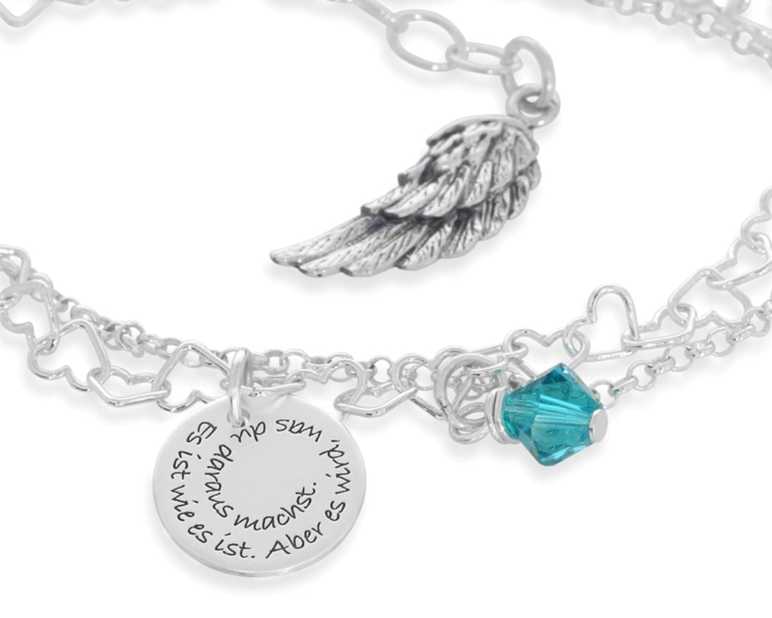 An dem Armband ist ein Engelsflügel, ein Kristallanhänger und ein besonderes Gravurplättchen (ca. 1,3 cm groß) befestigt. Das Plättchen wird mit einer hochwertigen Spiralgravur personalisiert. Hierfür stehen Ihnen max. ca. 55 Zeichen inkl. Leerzeichen zur Verfügung.