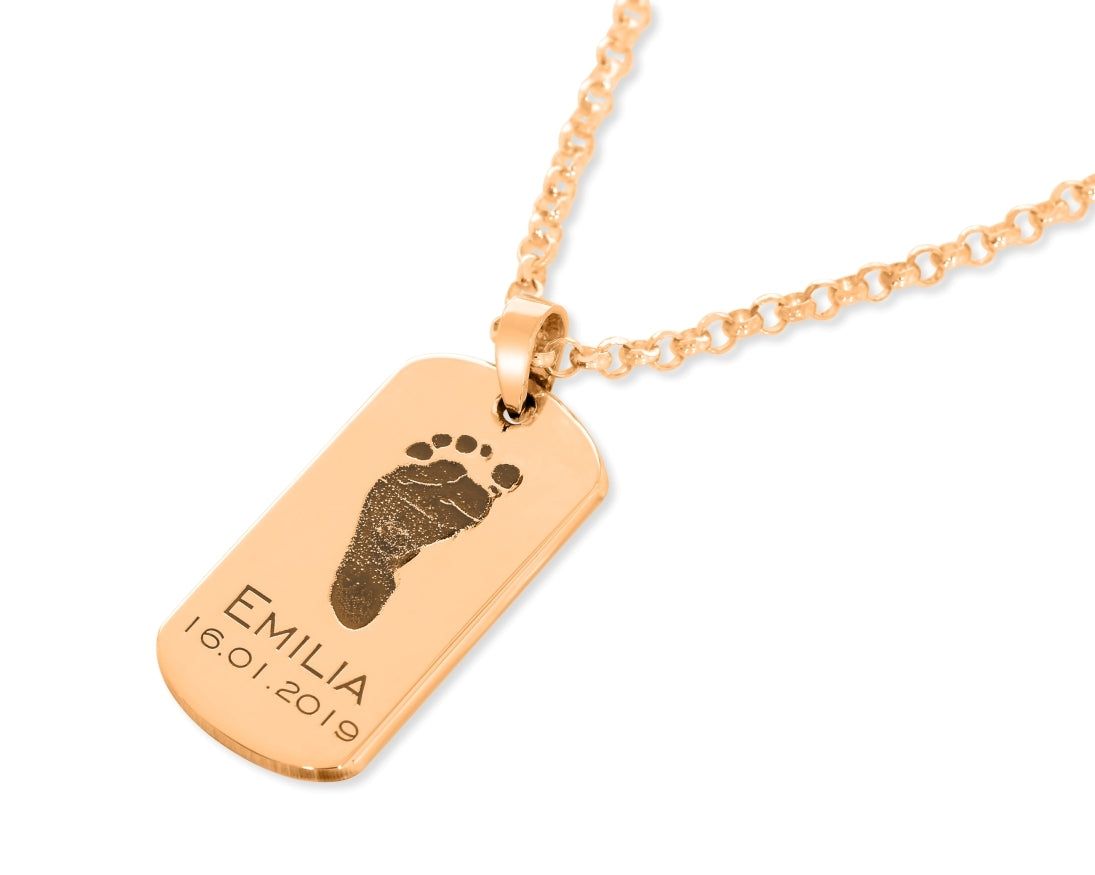 DOG TAG KETTE ROSÉ VERGOLDET GRAVUR FUßABDRUCK HANDABDRUCK BABY