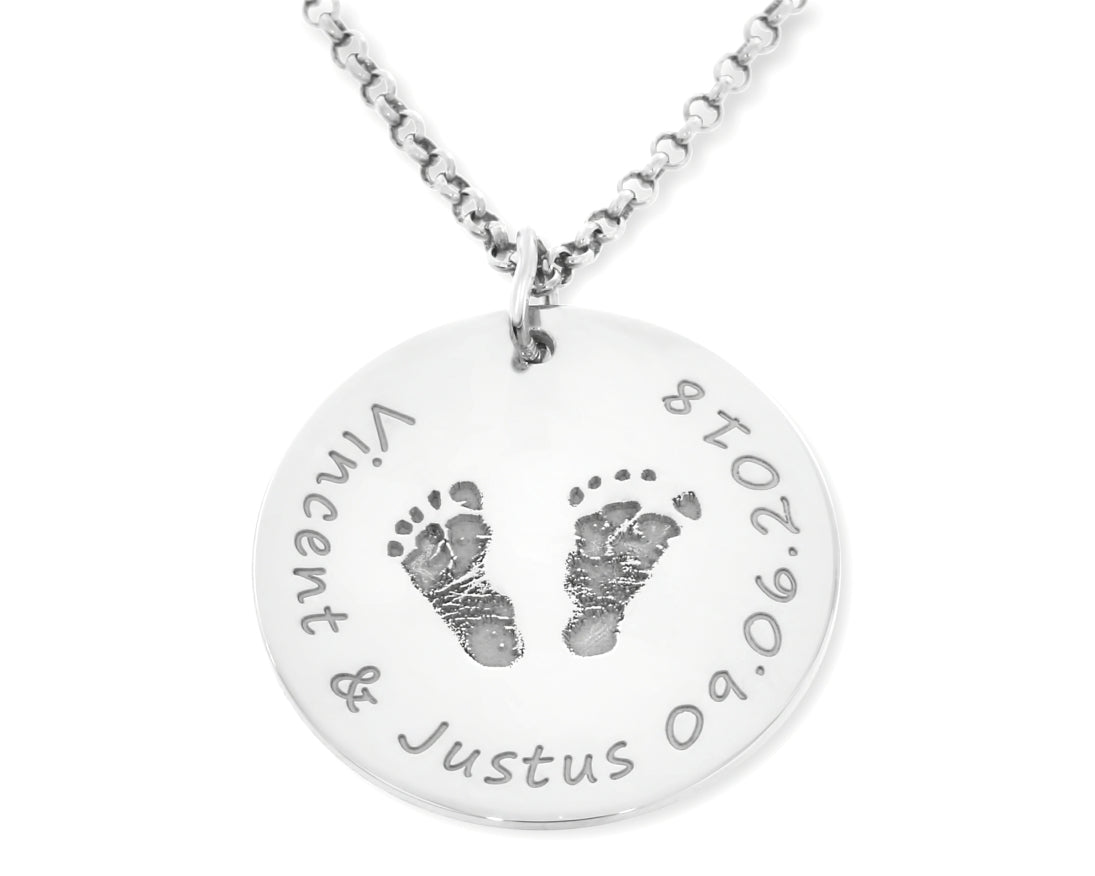 Eine exklusive Kette mit einer Gravurplatte aus 925 Sterling Silber Plättchen (ca. 2,3 cm groß) mit Ihrem eigenen Fußabdruck und Ihrem Wunschtext graviert. Auf dem Anhänger können mittig zwei Fußabdrücke und Ihr Wunschtext mit max. 32 Zeichen inkl. Leerzeichen designed werden.