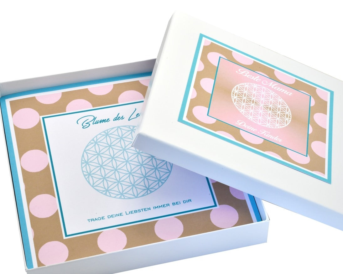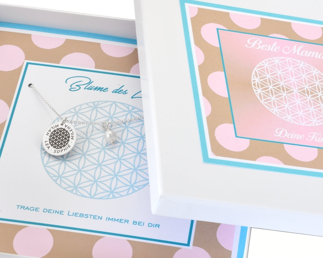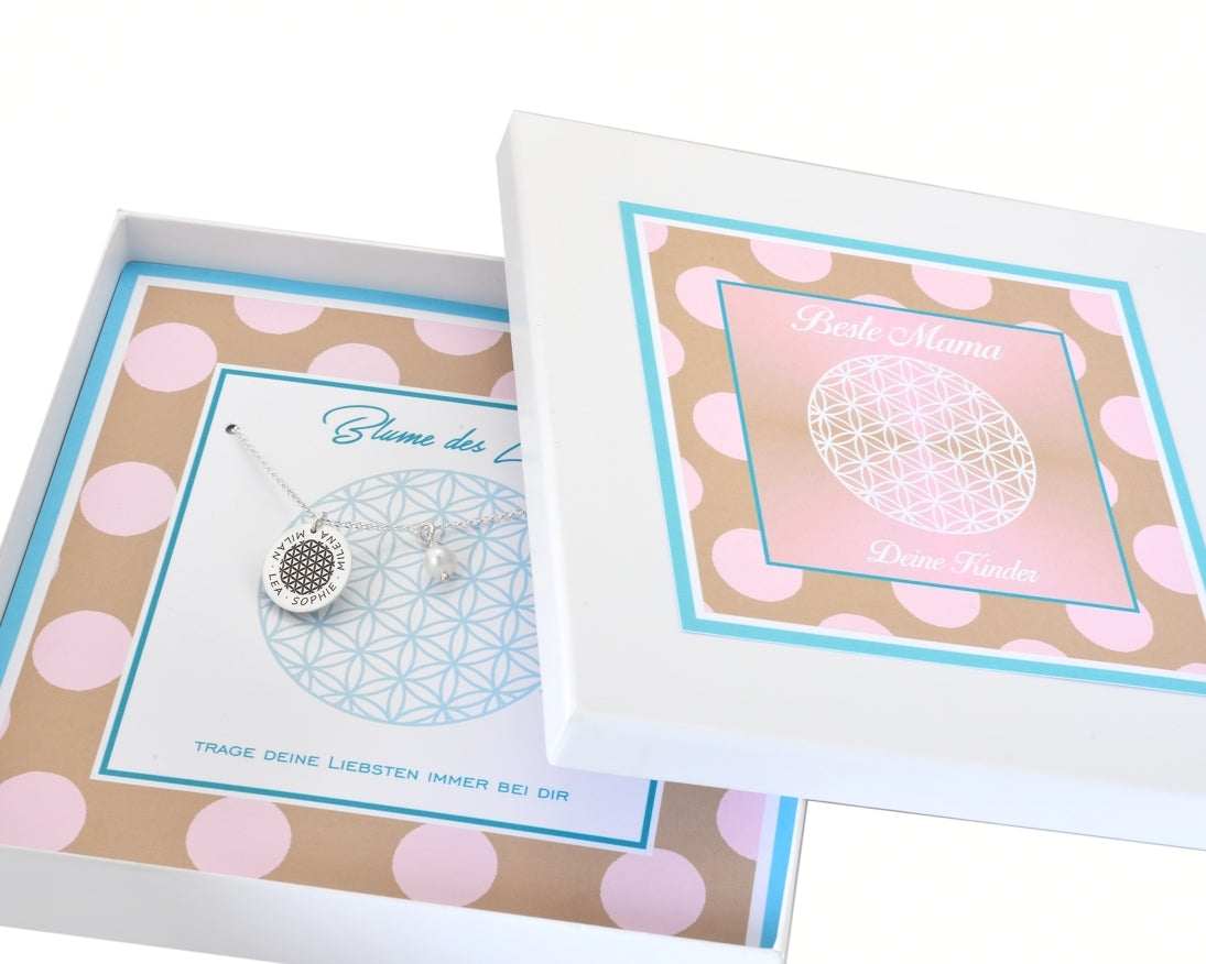 GESCHENK SCHACHTEL BLUME DES LEBENS PERLE SILBERSCHMUCK MIT GRAVUR