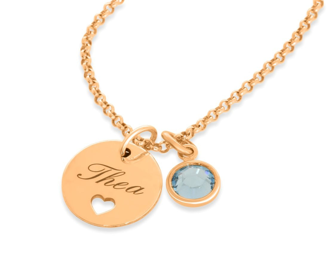 Das Plättchen ist ca. 1,3 cm groß und kann mit max. ca. 8 Zeichen inkl. Leerzeichen graviert werden. In dem Gravurplättchen ist ein niedlichen Herz ausgeschnitten. Daneben hängt ein herrlich funkelnder Swarovski Geburtsstein in der Farbe des Geburtsmonats oder in Ihrer Wunschfarbe.