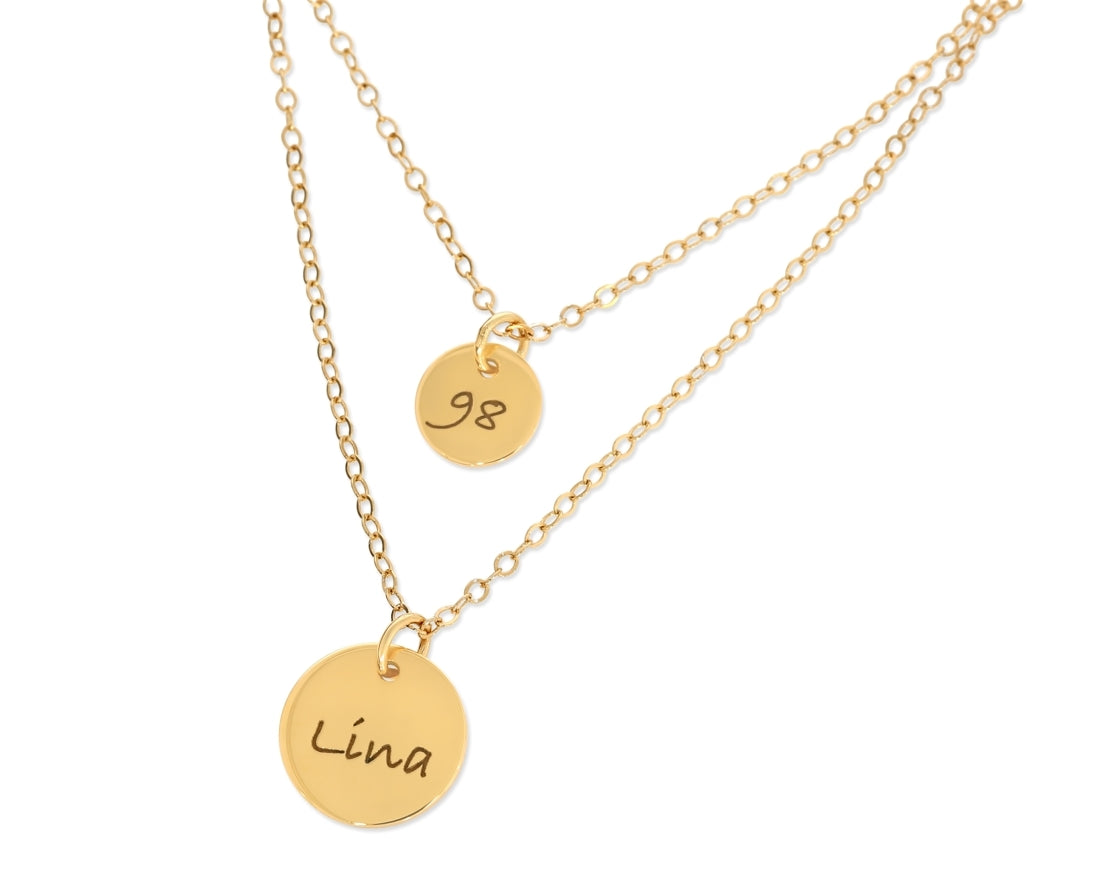 Eine wunderschöne 2-lagige Kette aus 925 Sterling Silber mit kleinen 925 Sterling Silber Gravurplättchen. Ausgehend von der kürzeren Kette ist diese in den Kettenlängen von ca. 38-50cm verfügbar. Die zweite, längere Kette wird dann entsprechend von uns angepasst.