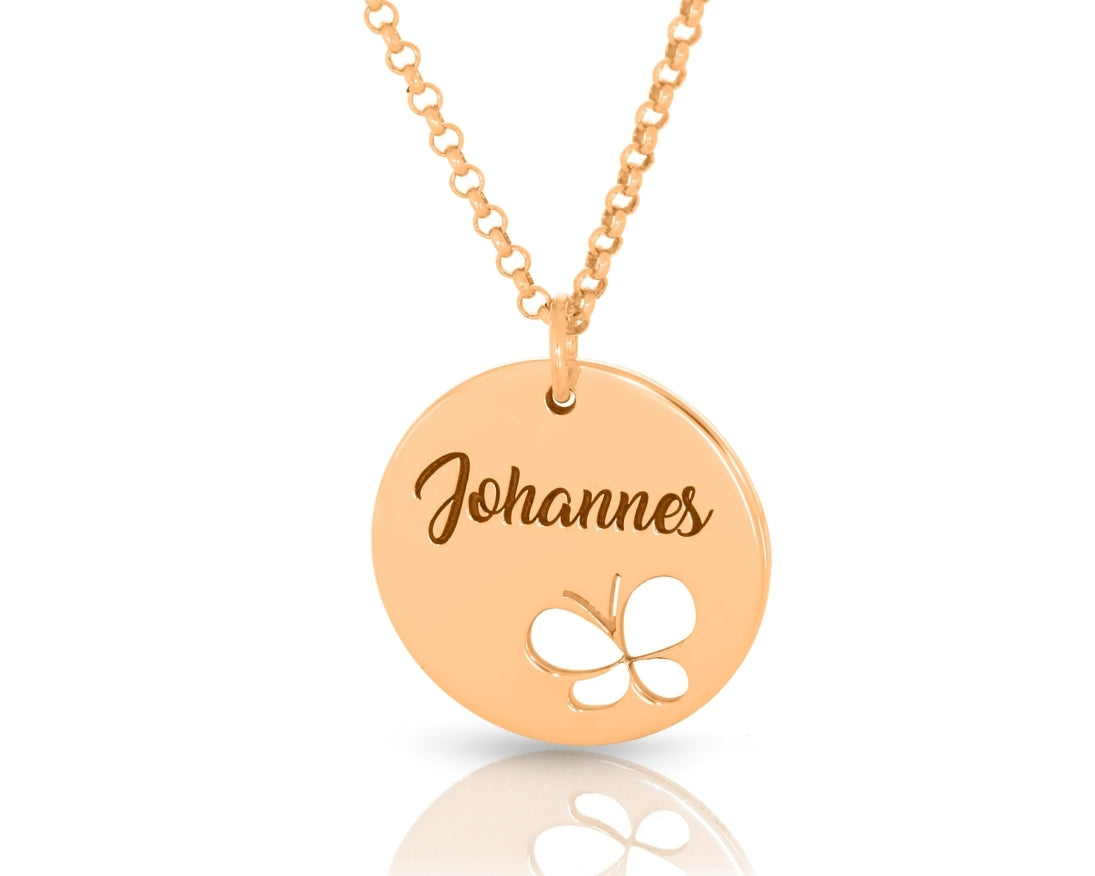 Eine wunderschöne Kette mit Gravuranhänger ist ca. 2,0 cm groß. In dem Anhänger ist ein niedlicher Schmetterling ausgeschnitten. Das Plättchen ist glänzend poliert. Es Für Ihren Wunschnamen passen max. ca. 10 Zeichen auf den Anhänger.