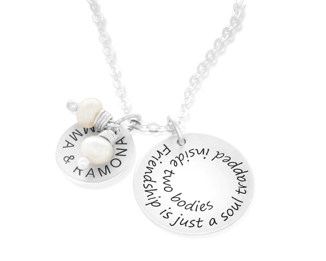 Eine wunderschöne Silberkette mit einem ca. 2,3cm großen Gravur Anhänger auf dem Ihr Wunschtext mit max. ca. 80 Zeichen inkl. Leerzeichen spiralförmig graviert wird. Auf dem ca. 1,3cm großen Anhänger stehen Ihnen max. ca. 16 Zeichen inkl. Leerzeichen zur Verfügung. Vor dem 1,3cm großen Gravurplättchen hängen zwei helle Süßwasserperlen.