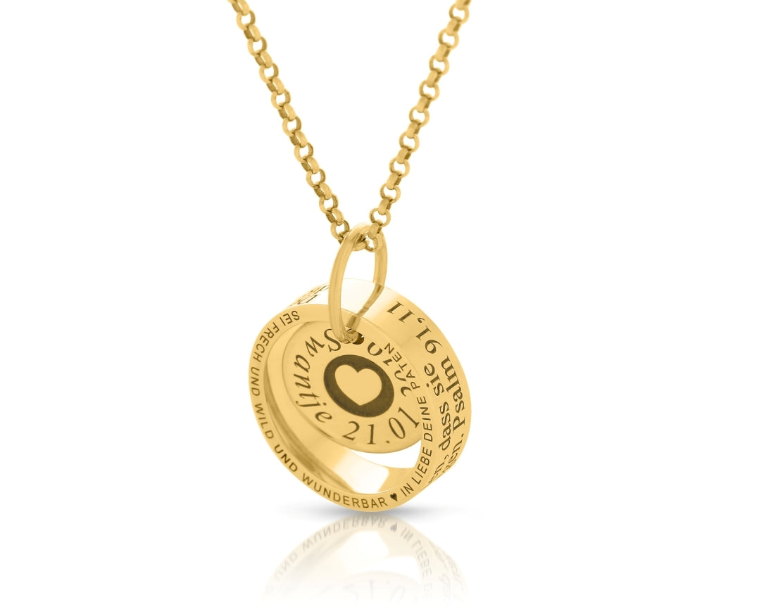 Ein wunderschöne Taufkette aus vergoldetem 925 Sterling Silber mit einem besonderen Ringanhänger designed mit Ihren Wunschnamen bzw. Wunschtext. In dem Anhänger hängt ein kleines ca. 1,3 cm großes Gravurplättchen mit Herzmotiv, welches am Rand mit Ihrem Wunschnamen oder Daten (ca. 18 Zeichen inkl. Leerzeichen) graviert werden kann.