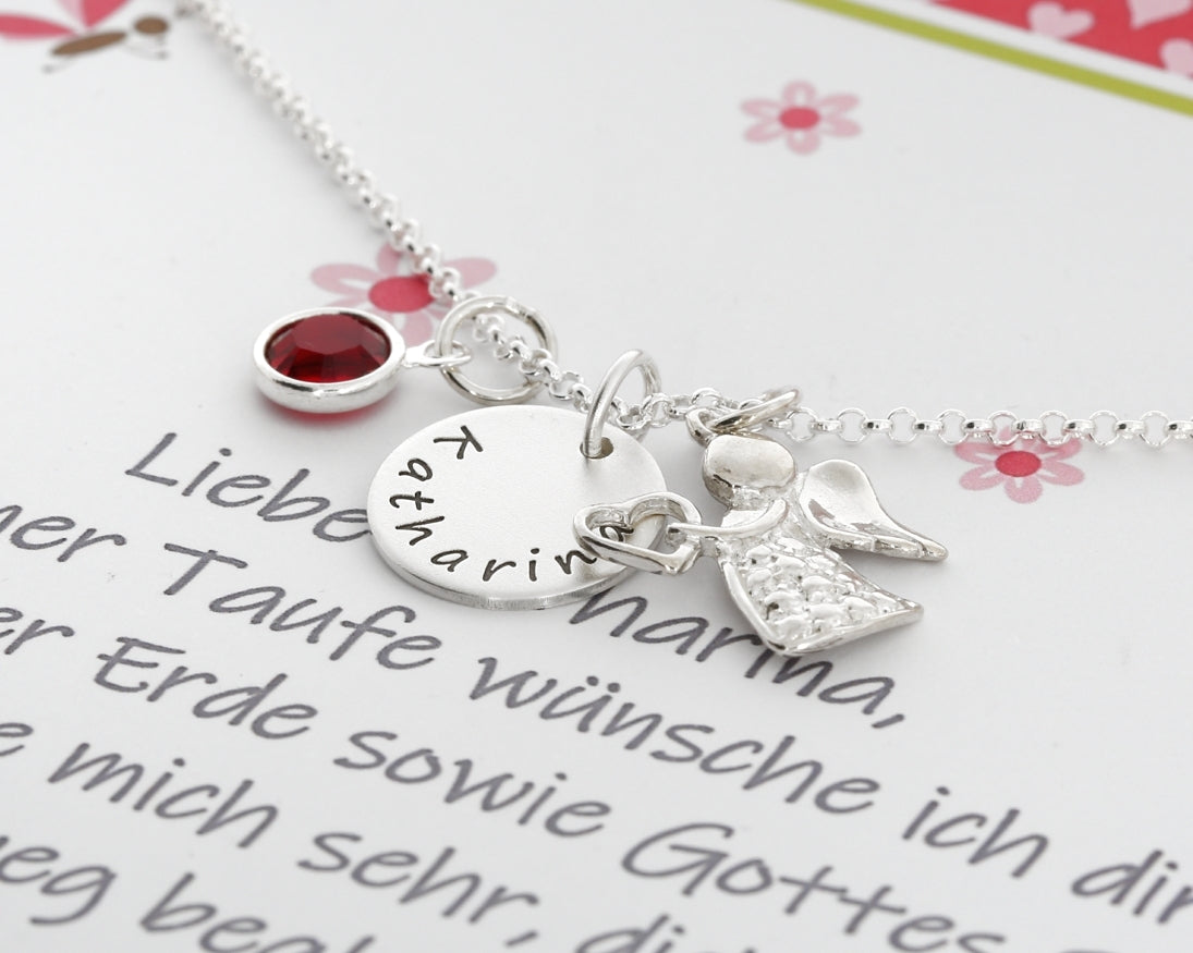 An der Kette hängt ein kleines 925 Sterling Silber Namensplättchen (ca.1,3cm groß), welches mit Ihrem Wunschnamen, Wunschdatum etc. mit max. 16 Zeichen inkL. Leerzeichen graviert wird. Daneben hängt ein zauberhafter Engel/Schutzengel Anhänger aus 925 Silber und ein Swarovski Geburtsstein in der Farbe des Geburtsmonats oder in Ihrer Wunschfarbe. Der Anhänger hängt an einer 925 Sterling Silber Kette in Ihrer Wunschlänge.