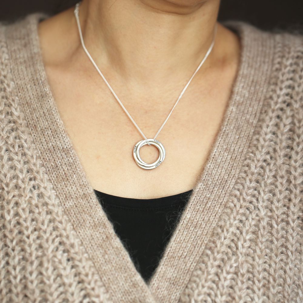 Der Anhänger, der per Hand geformt und anschließend hochwertig graviert wird, ist ca. 2,3cm groß (ein einzelner Ring) und aus massiven Silber, so dass er wunderschön auf der Haut liegt. Der Anhänger wird mit einer separaten Öse an die Kette befestigt (siehe Foto).