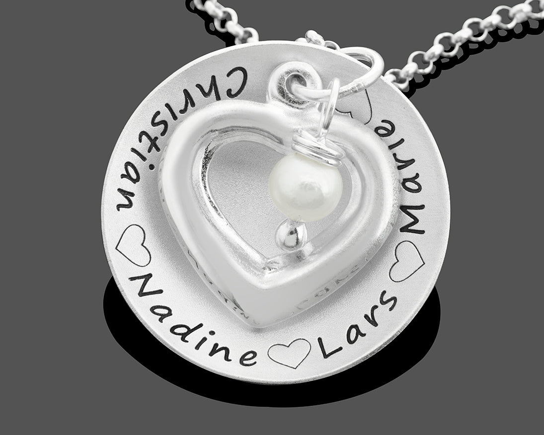 Eine besondere personalisierte Familien Kette komplett aus 925 Sterling Silber mit einem exklusiven, gewölbten 925 Sterling Silber Anhänger (ca.2,3cm). In der Mitte hängt ein 925 Sterling Silber Herz Anhänger mit einer weißen Süßwasserperle. Auf dem Plättchen wird Ihr Wunschtext bzw. Ihre Wunschnamen designed. Es passen ca. 32 Zeichen inkl. Leerzeichen spiralförmig auf den Anhänger rauf.