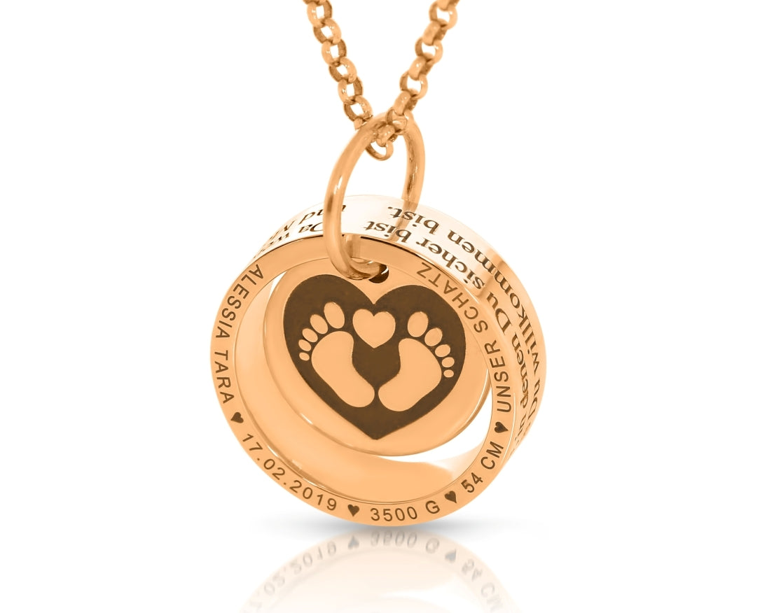 Ein wunderschöne Kette aus vergoldetem 925 Sterling Silber mit einem besonderen Ringanhänger designed mit Ihren Wunschnamen bzw. Wunschtext. In dem Anhänger hängt ein kleines ca. 1,3 cm großes Plättchen mit Herz-&Babyfußmotiv. Auf dem Ring wird umlaufend außen Ihr Wunschtext graviert. Hierfür stehen Ihnen insgesamt ca. 140 Zeichen inkl. Leerzeichen zur Verfügung. Auf dem schmalen Rand des Ringes (Sichtkante) kann mit max. 70 Zeichen inkl. Leerzeichen Ihr Wunschtext / Daten etc. graviert werden.