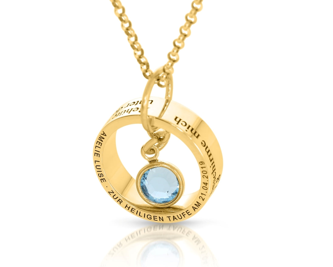 Ein wunderschöne Taufkette aus vergoldetem 925 Sterling Silber mit einem besonderen Ringanhänger designed mit Ihren Wunschnamen bzw. Wunschtext. In dem Anhänger hängt ein Swarovski Geburtsstein in der Farbe des Geburtsmonats oder in Ihrer Wunschfarbe. Das Schmuckstück wird in Juwelierqualität hochwertig vergoldet.