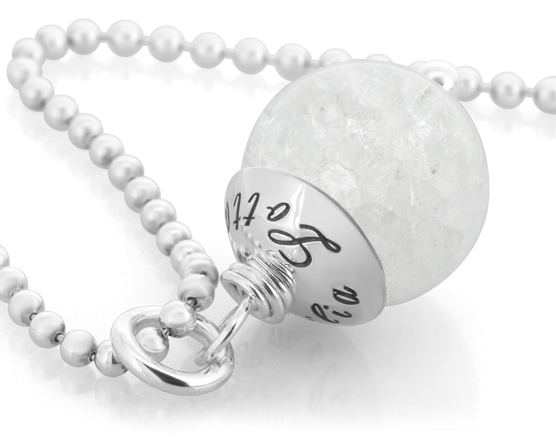 Innen ist eine Perle aus Bergkristall und aussen ein Plättchen aus 925 Sterling Silber. Das Plättchen ist gewölbt, so dass der Anhänger wie eine Haselnuss aussieht. Auf dieser Kappe wird Ihr Wunschtext designed.