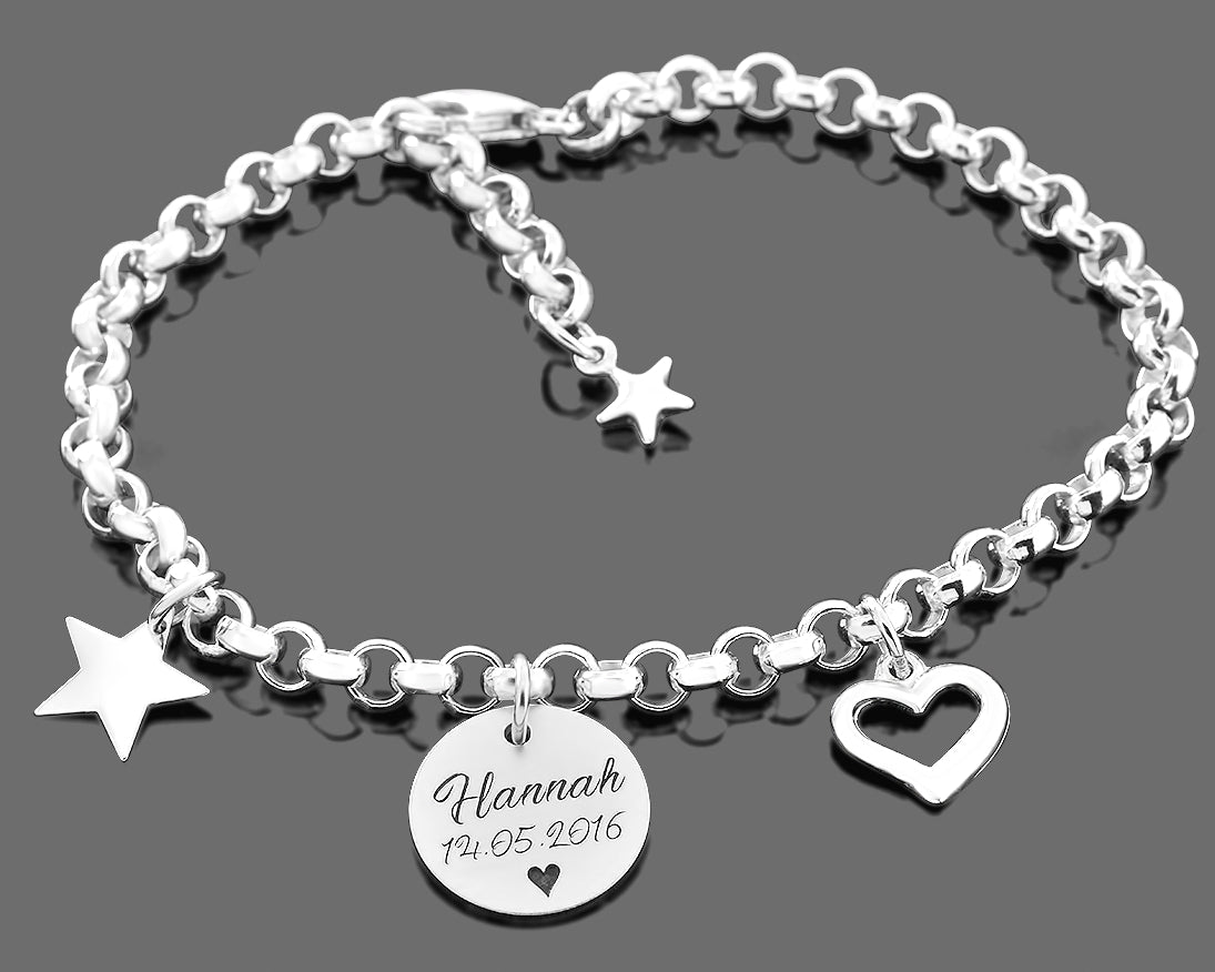 SILBERARMBAND MIT NAMEN, STERN & HERZ ANHÄNGER, DAMENSCHMUCK