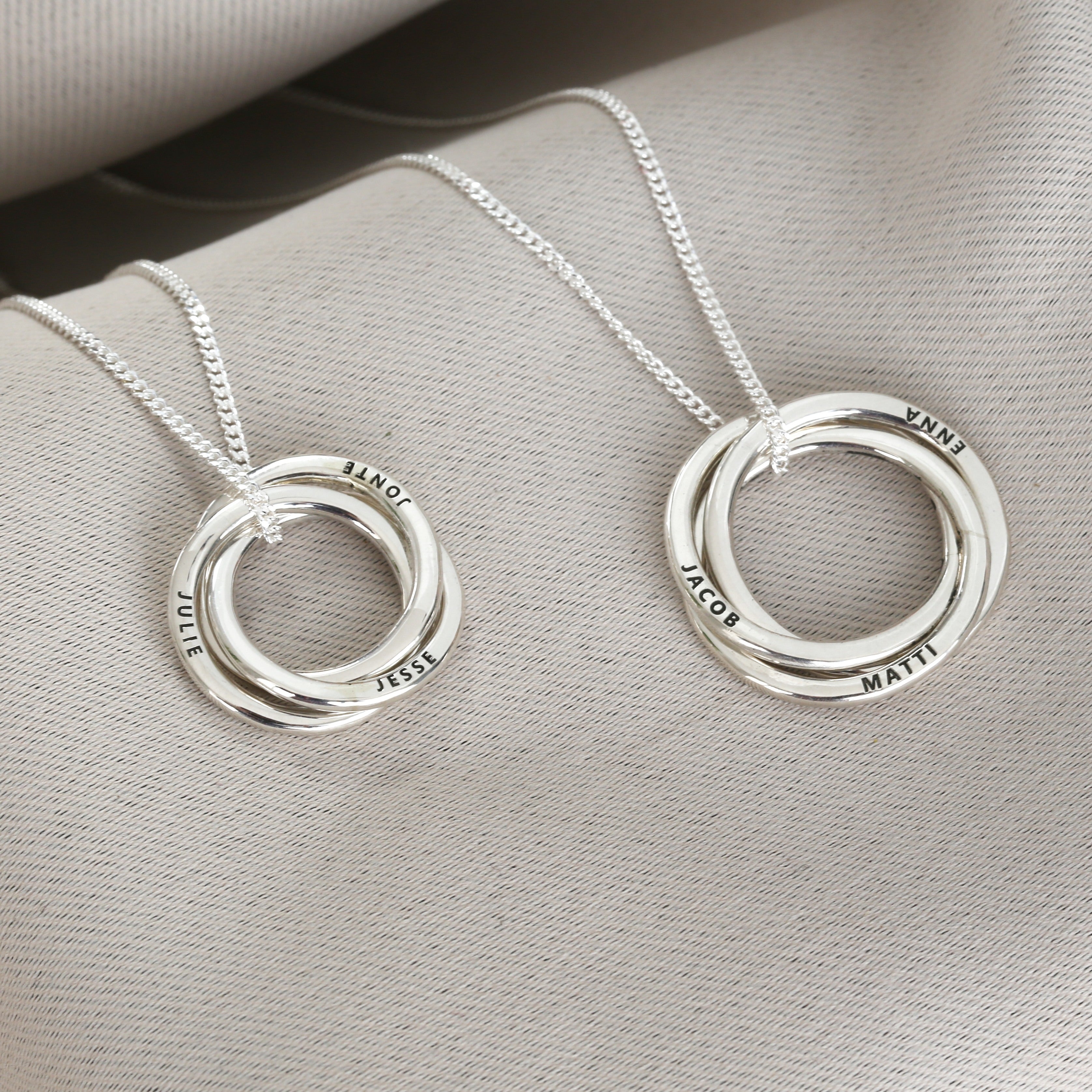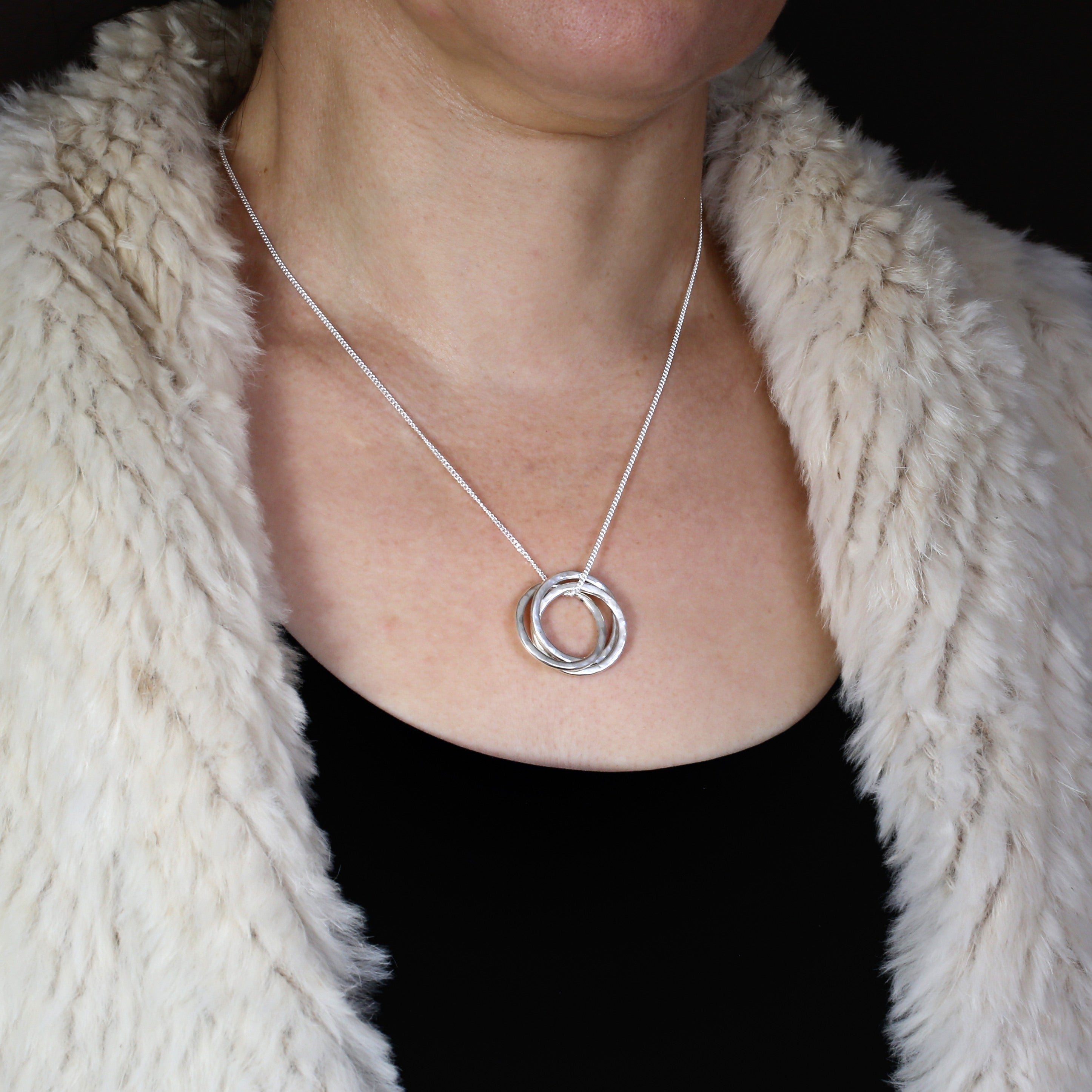 Der Anhänger, der per Hand geformt und anschließend hochwertig graviert wird, ist ca. 2,3cm groß (ein einzelner Ring) und aus massiven Silber, so dass er wunderschön auf der Haut liegt. Die drei Ringe hängen locker, sind aber miteinander verbunden. So wie Menschen miteinander verbunden sind.