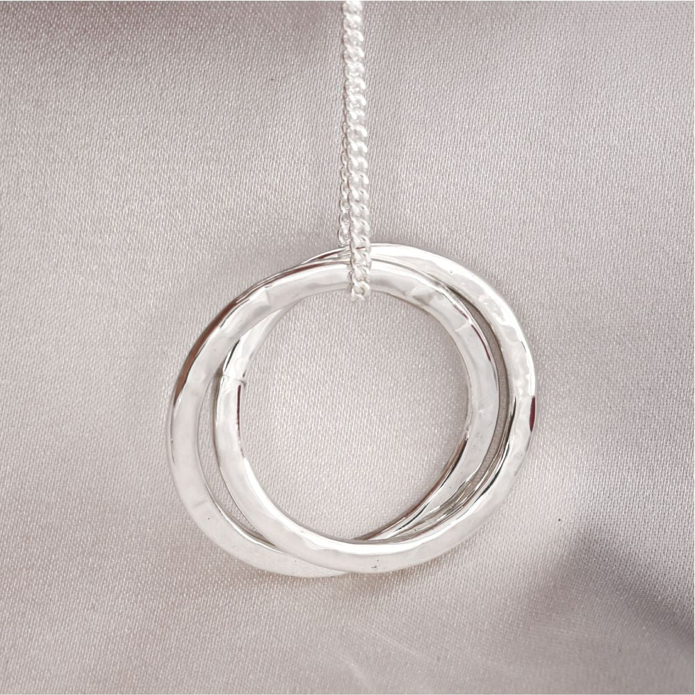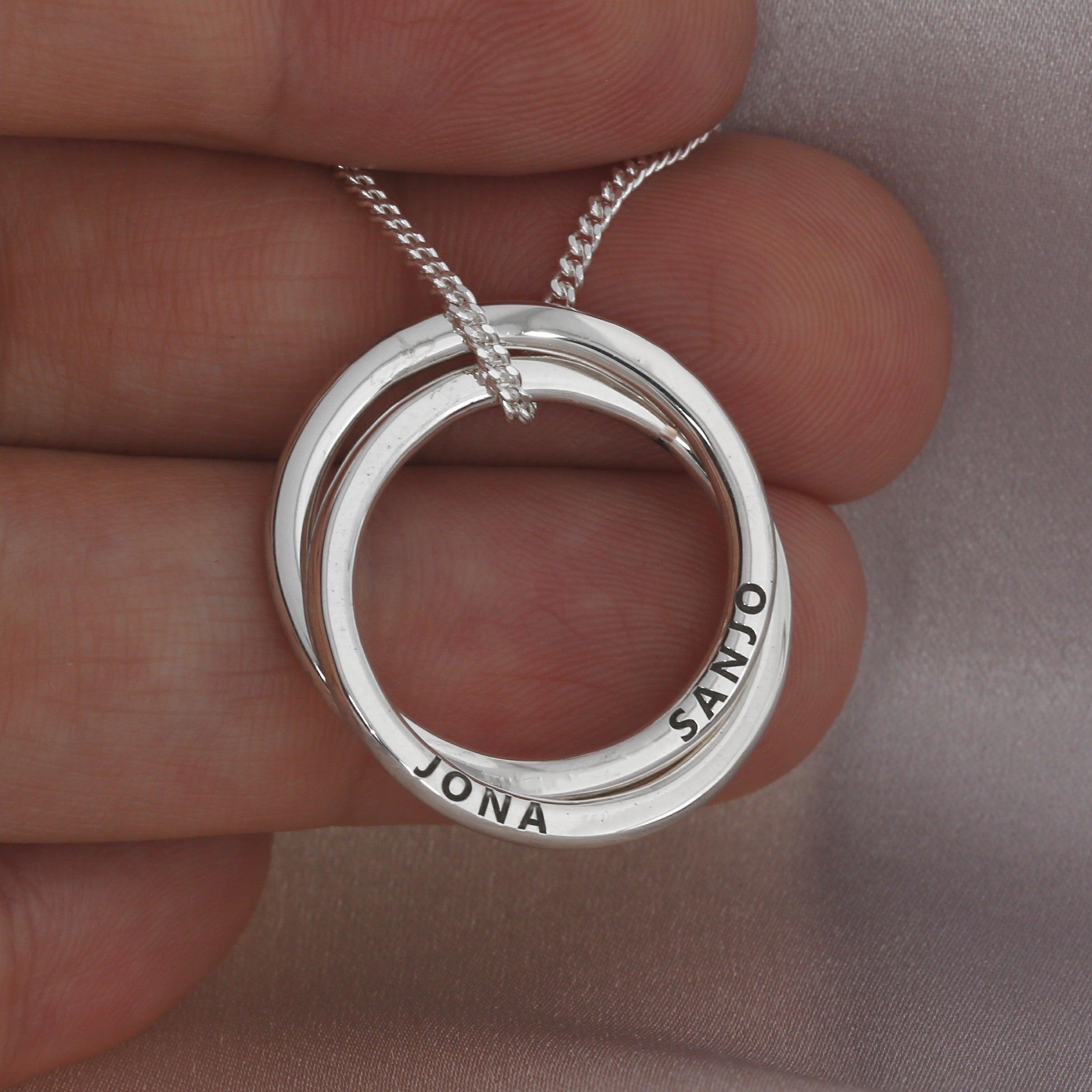 Der Anhänger, der per Hand geformt und anschließend hochwertig graviert wird, ist ca. 2,3cm groß (ein einzelner Ring) und aus massiven Silber, so dass er wunderschön auf der Haut liegt. Die Ringe hängen locker, sind aber miteinander verbunden. So wie Menschen miteinander verbunden sind.