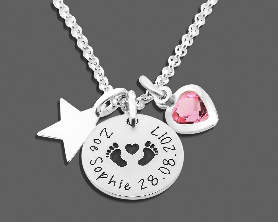 Eine wunderschöne Kette komplett aus 925 Sterling Silber mit einem 925 Sterling Silber Plättchen ( ca. 1,3cm groß) mit Ihrem Wunschnamen bzw. Wunschtext (maximal 21 Zeichen inkl. Leerzeichen) designed. Auf dem Plättchen sind niedliche Babyfüßchen und ein wunderschönes Herz graviert. Daneben hängt ein bezaubernder Sternanhänger sowie ein Kristall Herz aus 925 Sterling Silber.