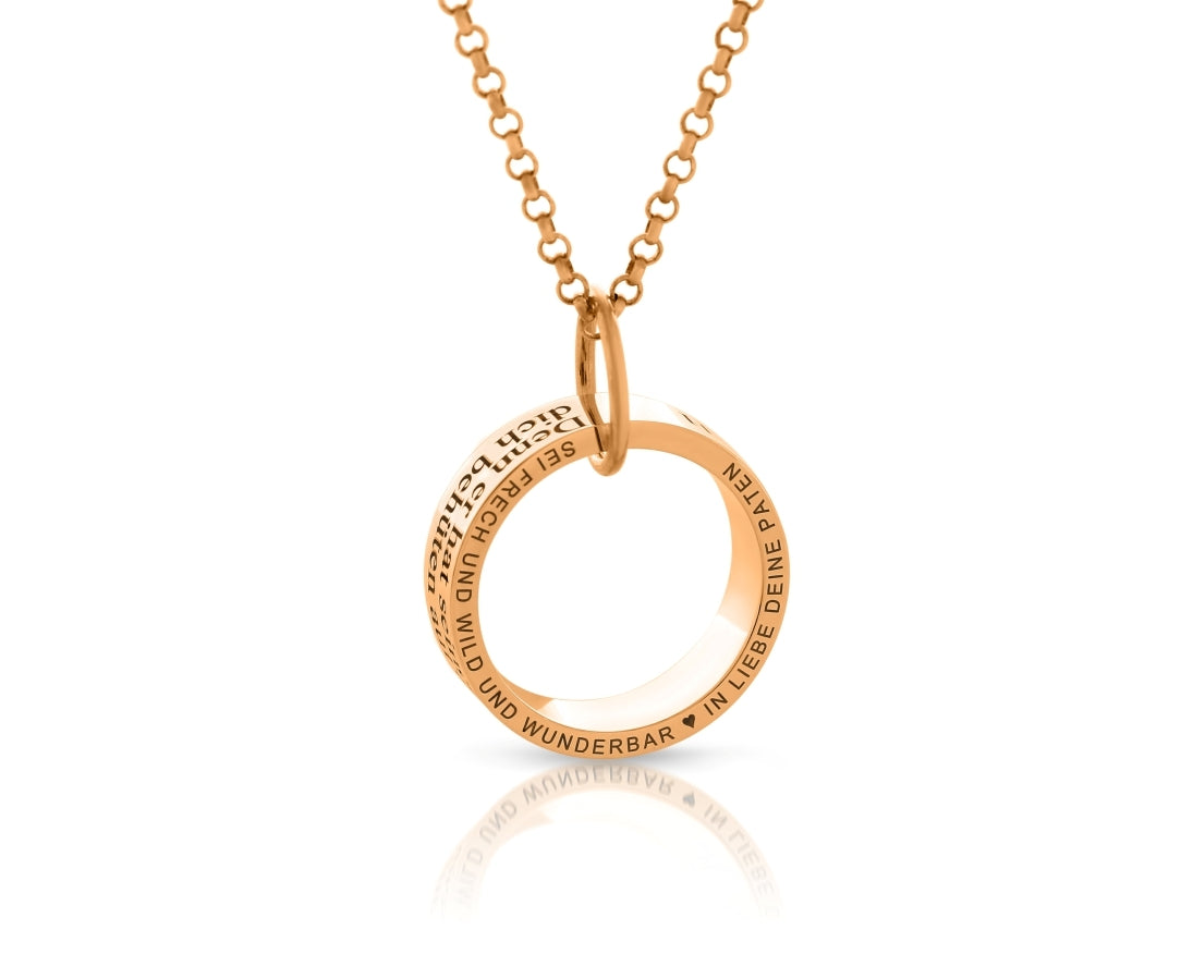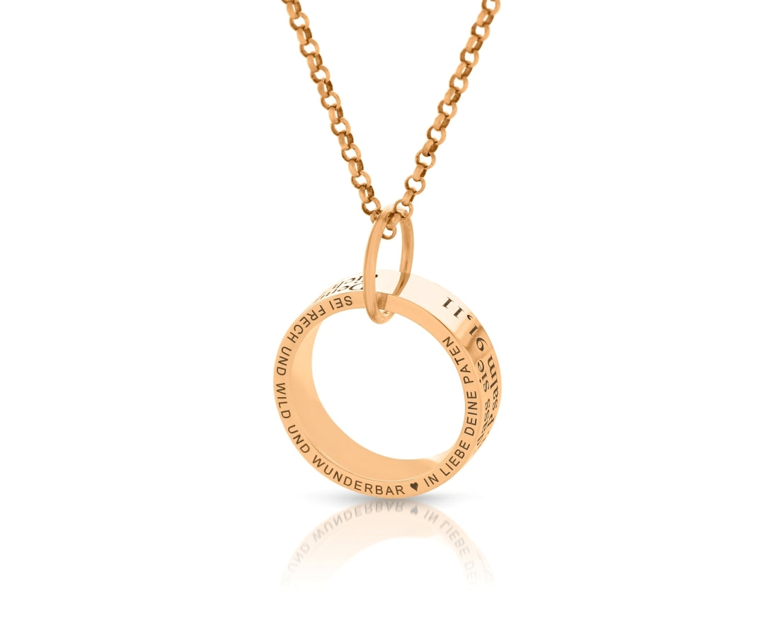 Ein wunderschöne Kette aus rosé vergoldetem 925 Sterling Silber mit Ring Anhänger, designed mit Ihren Wunschnamen bzw. Wunschtext. Der Ring hat einen Außendurchmesser von ca. 1,8 cm. Das komplette Schmuckstück wird in Juwelierqualität hochwertig rosé vergoldet.