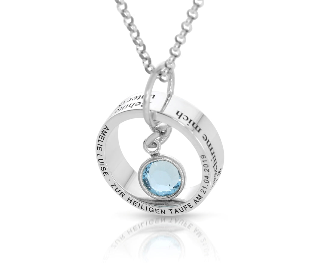 Ein wunderschöne Taufkette aus 925 Sterling Silber mit einem besonderen Ringanhänger designed mit Ihren Wunschnamen bzw. Wunschtext. In dem Anhänger hängt ein Swarovski Geburtsstein in der Farbe des Geburtsmonats oder in Ihrer Wunschfarbe.
