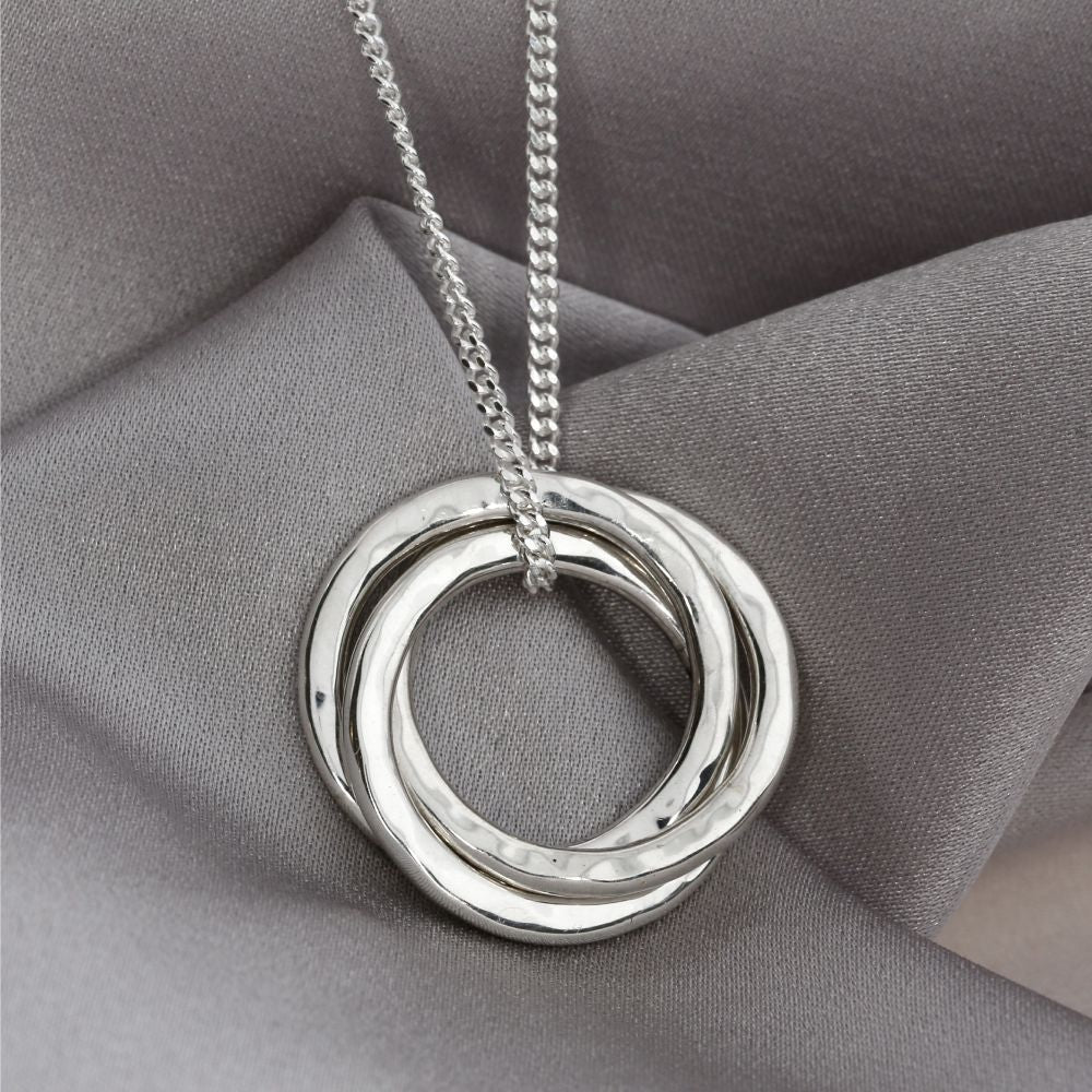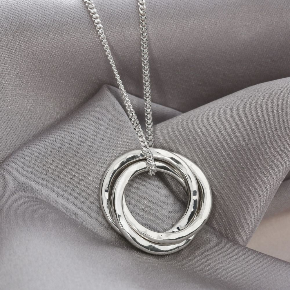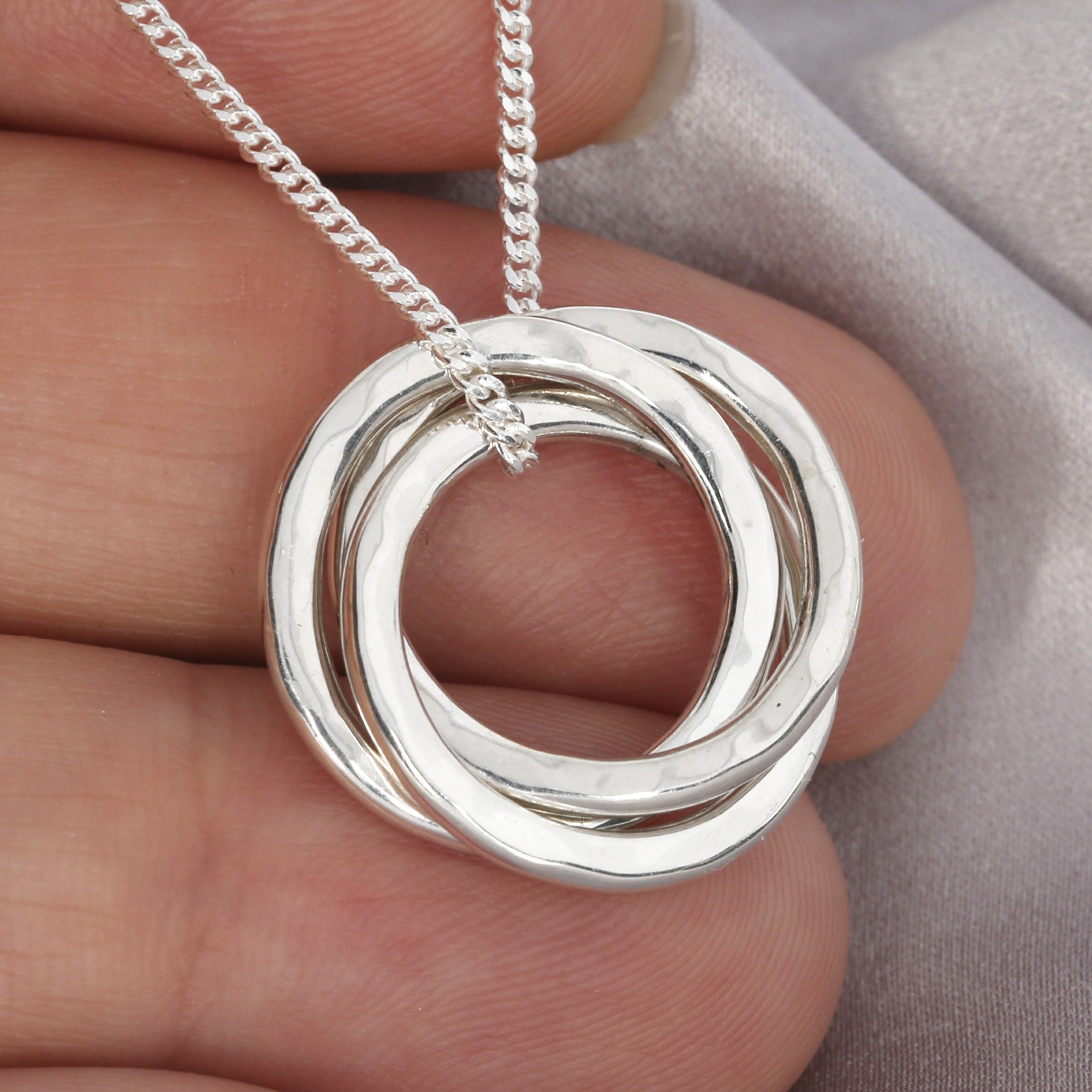 Der Anhänger, der per Hand geformt und anschließend hochwertig graviert wird, ist ca. 2cm groß (ein einzelner Ring) und aus massiven Silber, so dass er wunderschön auf der Haut liegt. Die drei Ringe hängen locker, sind aber miteinander verbunden. So wie Menschen miteinander verbunden sind.