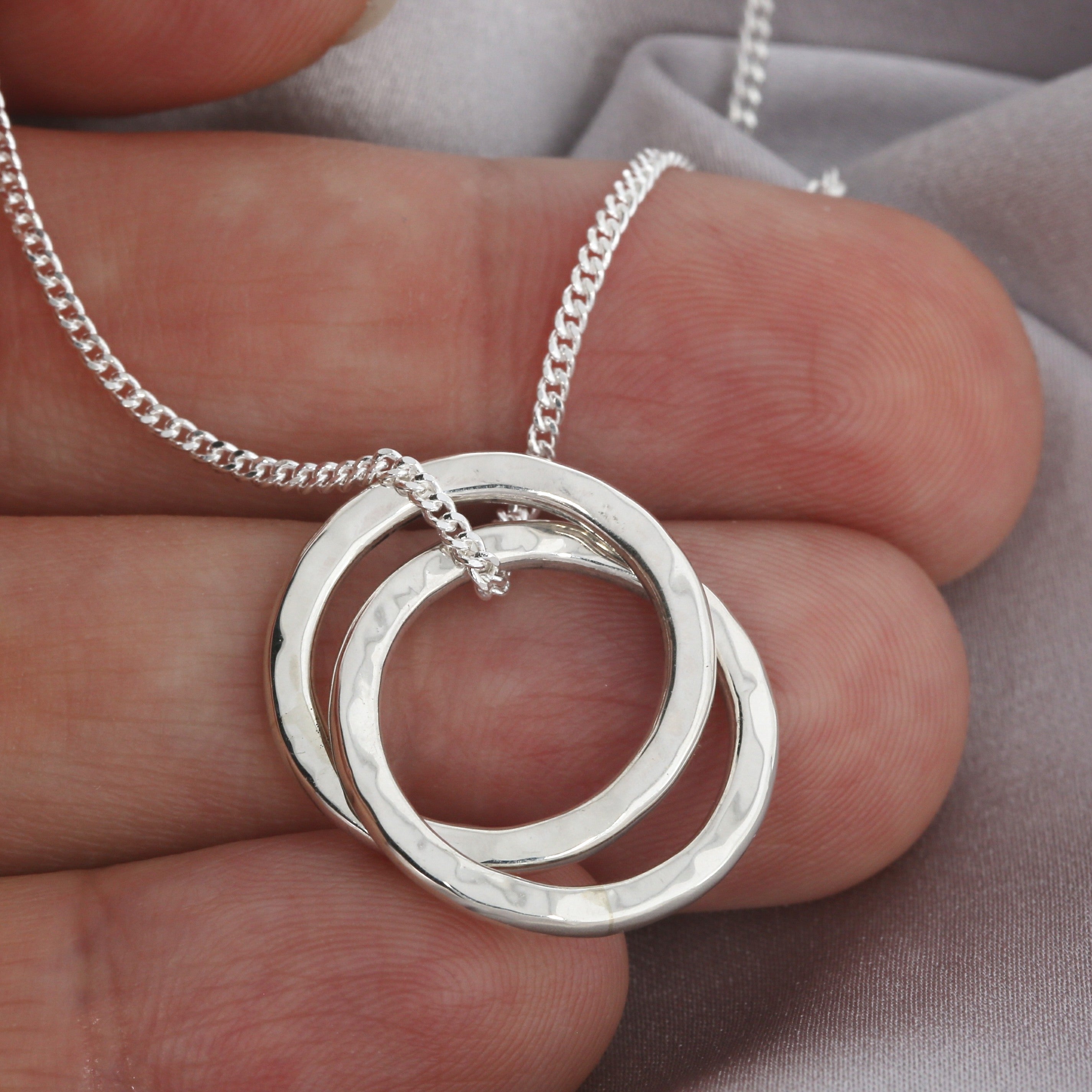 Der Anhänger, der per Hand geformt und anschließend hochwertig graviert wird, ist ca. 2cm groß (ein einzelner Ring) und aus massiven Silber, so dass er wunderschön auf der Haut liegt. Die beiden Ringe hängen locker, sind aber miteinander verbunden. So wie Menschen miteinander verbunden sind.