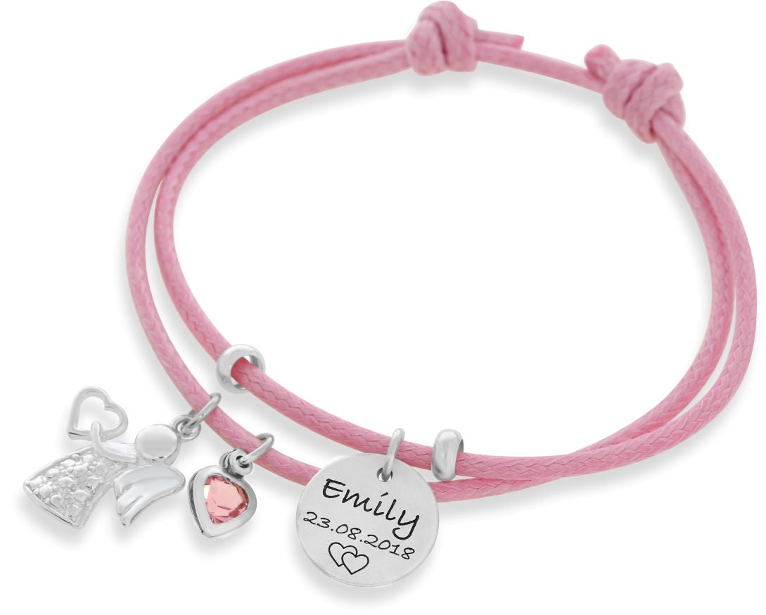 Ein farblich veredeltes ca. 1mm starken Baumwollband mit 925 Sterling Silber Anhängern. An dem Band hängt ein Namensplättchen (ca.1,3 cm groß) auf welches Ihr Wunschname bzw. Wunschdatum mit max. 16 Zeichen inkl. Leerzeichen sowie Ihr Wunschmotiv graviert wird. Daneben hängt ein wunderschöner Engel und Herz Anhänger aus 925 Sterling Silber. Der Herz Anhänger ist in den Farben weiß(klar), rosa oder blau möglich. Die Ösen werden von uns fachmännisch gelötet.