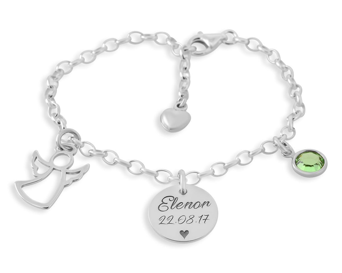 Ein wunderschönes Armband komplett aus 925 Sterling Silber mit einem niedlichen 925 Sterling Silber Engel und einem Geburtsstein. Am Ende der Kette hängt ein kleines Herz. An dem Armband hängt auch ein Gravurplättchen, welches mit Ihrem Wunschtext bzw. Ihren Wunschnamen sowie Wunschmotiv graviert wird. Das 925 Sterling Silber Plättchen ist ca. 1,3 cm groß. Es passen maximal ca. 20 Zeichen inkl. Leerzeichen rauf.